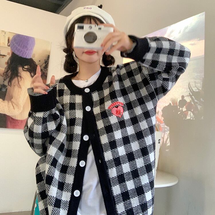 ニット カーディガン ロング丈 長袖 柄 チェック 秋 冬 ストレート Iライン 前開き かわいい 大人可愛い きれいめ シンプル カジュアル 大人 おしゃれ お洒落 レトロ 大人可愛い 大人女子 ラフ キュート ガーリー ルーズ Uネック ロング 袖あり 黒 ブラック 青 ブルー ピンク S M L ゆったり 20代 30代 学生 通学 デート お出かけ 女子会 休日 着回し 普段使い 韓国 韓国系 オルチャン ファッション コーデ モテ 送料無料 トレンド 流行 インスタ映え | Rena 韓国ファッション レディースアパレル