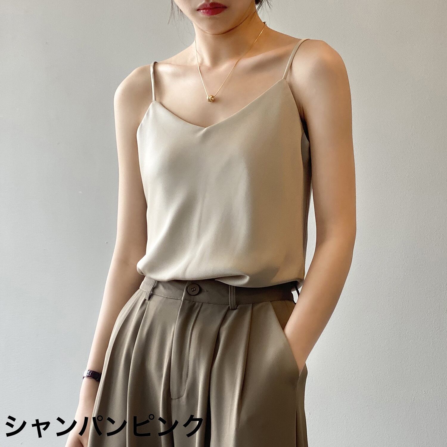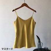 スパゲッティストラップにVネックデザイン、全体的にゆったりとしたシルエットで首元から胸元までがきれいに見え、上品な大人な女性を演出してくれます。