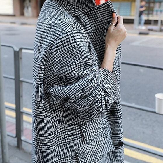 アクセントにもなっているポケットや大き目の襟元、千鳥格子柄がシックで大人っぽい印象を与えます。