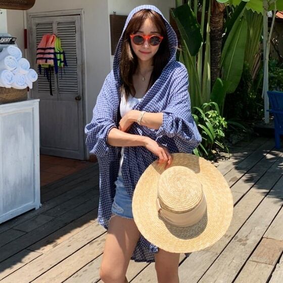 夏にピッタリな薄手のチェック柄フード付きシャツです。