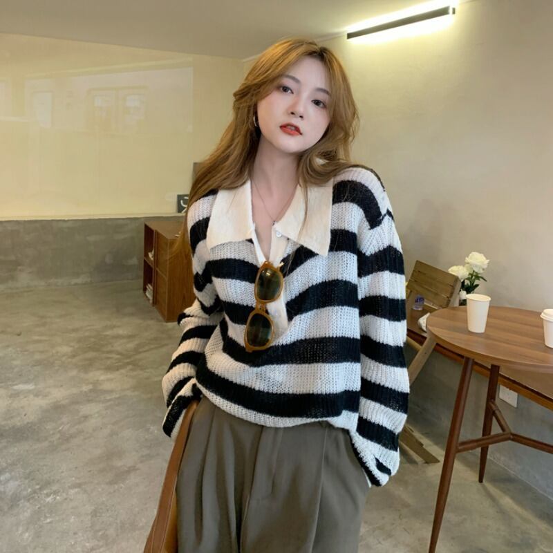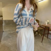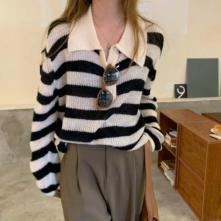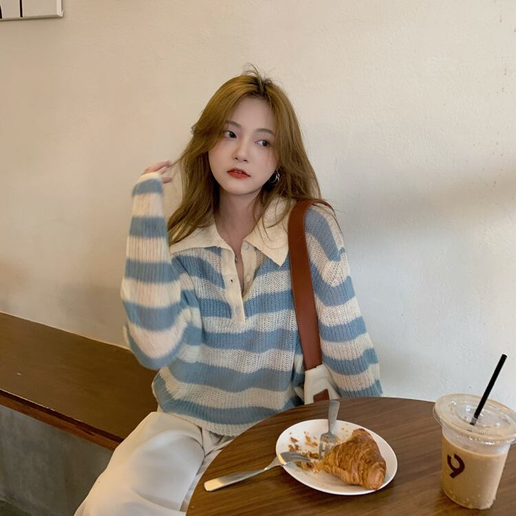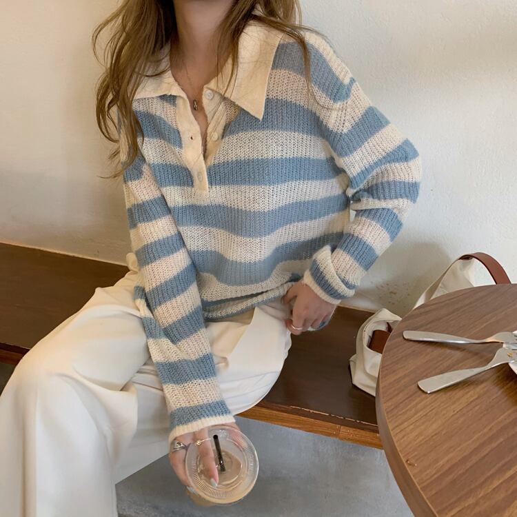 セーター 長袖 ストライプ 秋 かわいい 大人可愛い きれいめ シンプル カジュアル 大人 上品 おしゃれ お洒落 大人女子 ラフ キュート 個性的 主役級 存在感 袖あり 黒 ブラック 青 ブルー フリーサイズ ゆったり 10代 20代 30代 女性用 学生 通学 デート お出かけ 公園デビュー 女子会 休日 着回し 普段使い ファッション コーデ モテ 送料無料 インスタ映え | Rena 韓国ファッション レディースアパレル