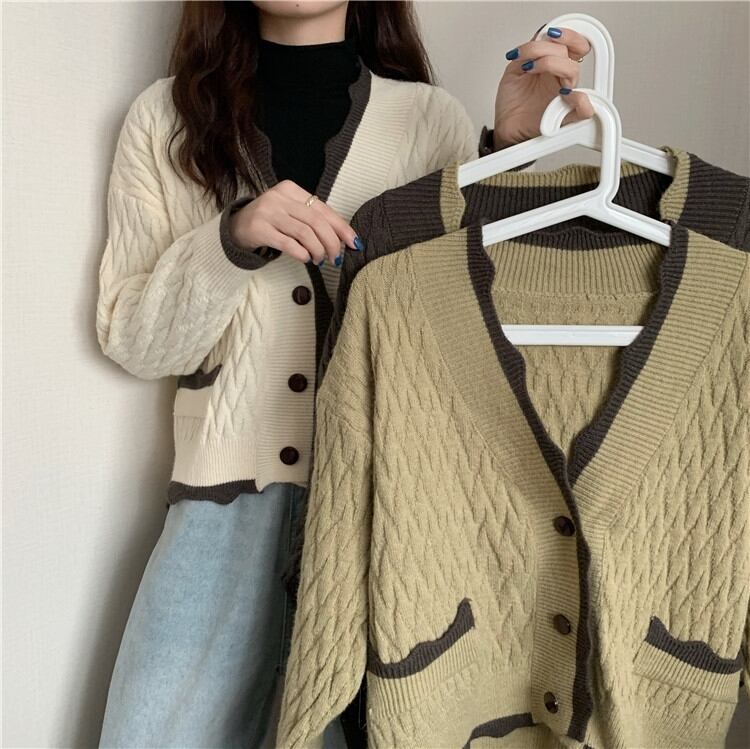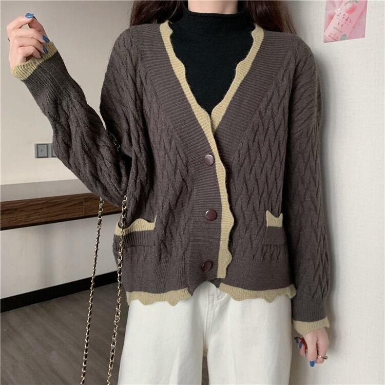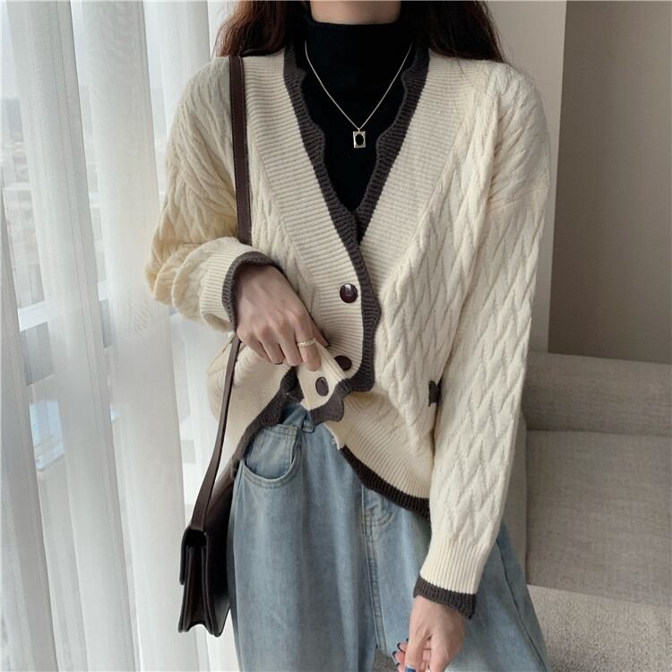 レトロなデザインにバイカラーが映えるニットカーディガンです。