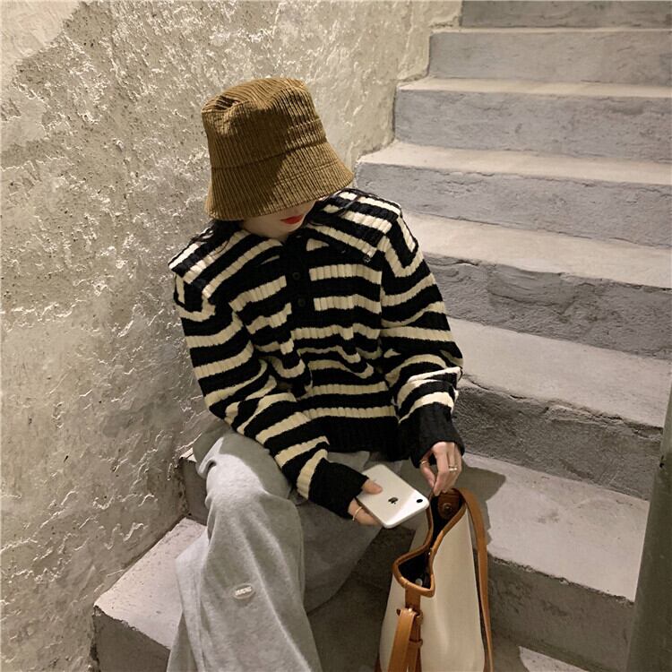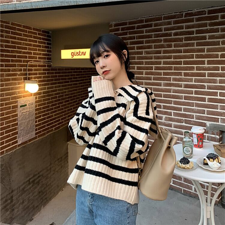 セーター 長袖 ボーダー 春 秋 冬 ストレート かわいい 大人可愛い きれいめ シンプル カジュアル 大人 上品 おしゃれ かっこいい レトロ 大人女子 こなれ感 ラフ ラブリー キュート ガーリー エレガント 襟付き 袖あり ホワイト ブラック 大人カラー フリーサイズ 10代 20代 30代 40代 オフィス ビジネス OL 通勤 学生 通学 デート お出かけ 女子会 休日 旅行 着回し 普段使い ファッション コーデ スタイル 送料無料 | Rena 韓国ファッション レディースアパレル