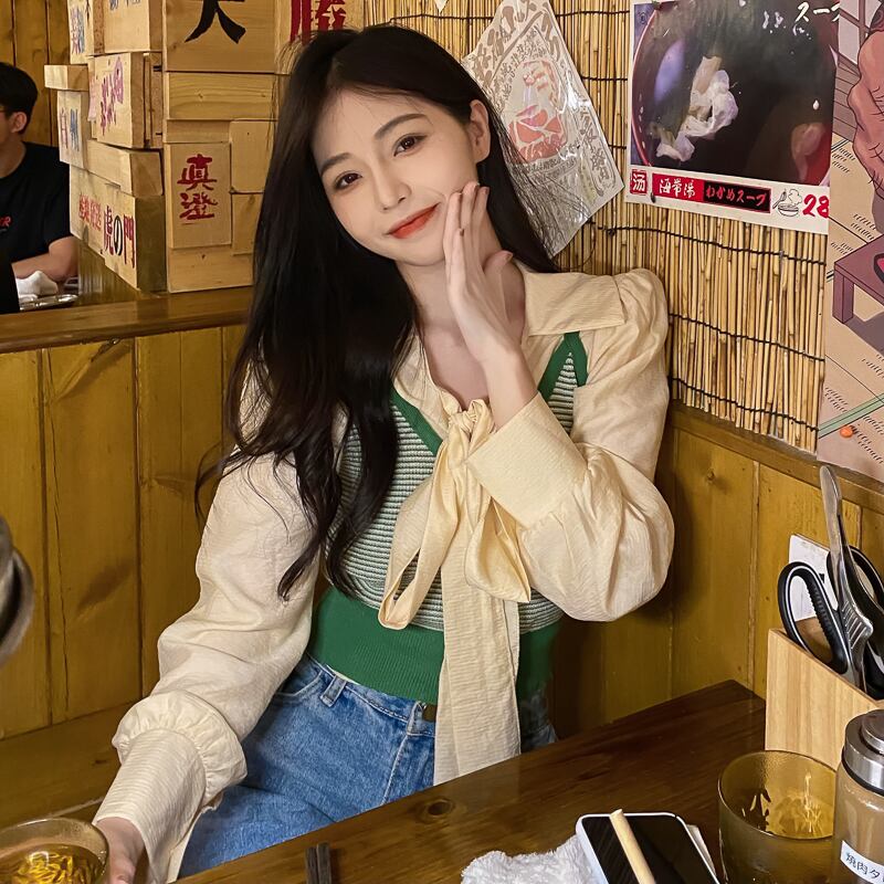 ブラウス ベスト ノースリーブ 長袖 無地 ボーダー 春 秋 タイト ストレート リボン 伸縮性 かわいい 大人可愛い きれいめ シンプル カジュアル 大人 上品 おしゃれ レトロ 大人女子 こなれ感 ラブリー キュート ガーリー Vネック 襟付き 袖あり 2点セット グリーン オフホワイト 大人カラー 春カラー 秋カラー フリーサイズ 10代 20代 30代 40代 50代 OL 通勤 学生 通学 デート お出かけ 女子会 着回し 普段使い 重ね着 ファッション コーデ スタイル 送料無料 | Rena 韓国ファッション レディースアパレル