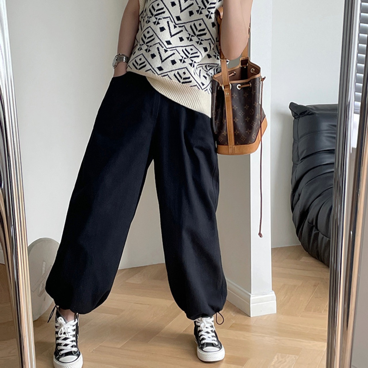 カジュアルな着こなしやすさが人気のワイドパンツです。