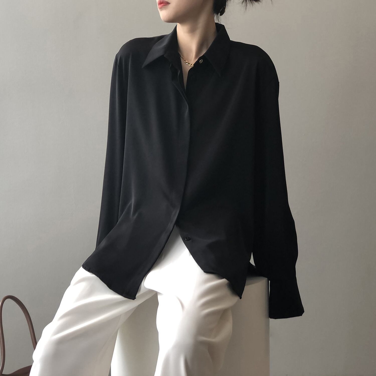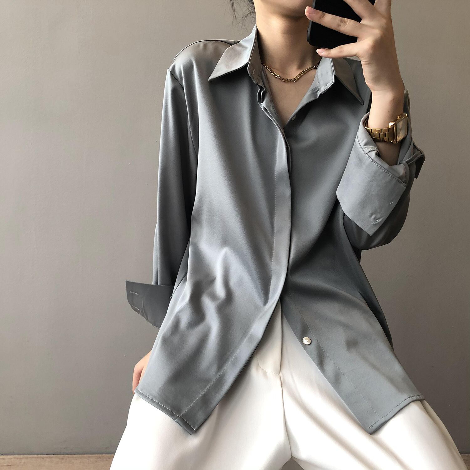 シャツ 長袖 無地 春 秋 ストレート 前開き きれいめ 大人 上品 おしゃれ お洒落 かっこいい 大人女子 こなれ感 マニッシュ クール モード系 セクシー 主役級 存在感 とろみ感 抜け感 襟なし 袖あり 白 ホワイト 黒 ブラック 灰色 グレー くすみカラー ニュアンスカラー 光沢 M L 20代 30代 40代 オフィス OL 通勤 パーティー イベント ファッション コーデ スタイル 送料無料 | Rena 韓国ファッション レディースアパレル
