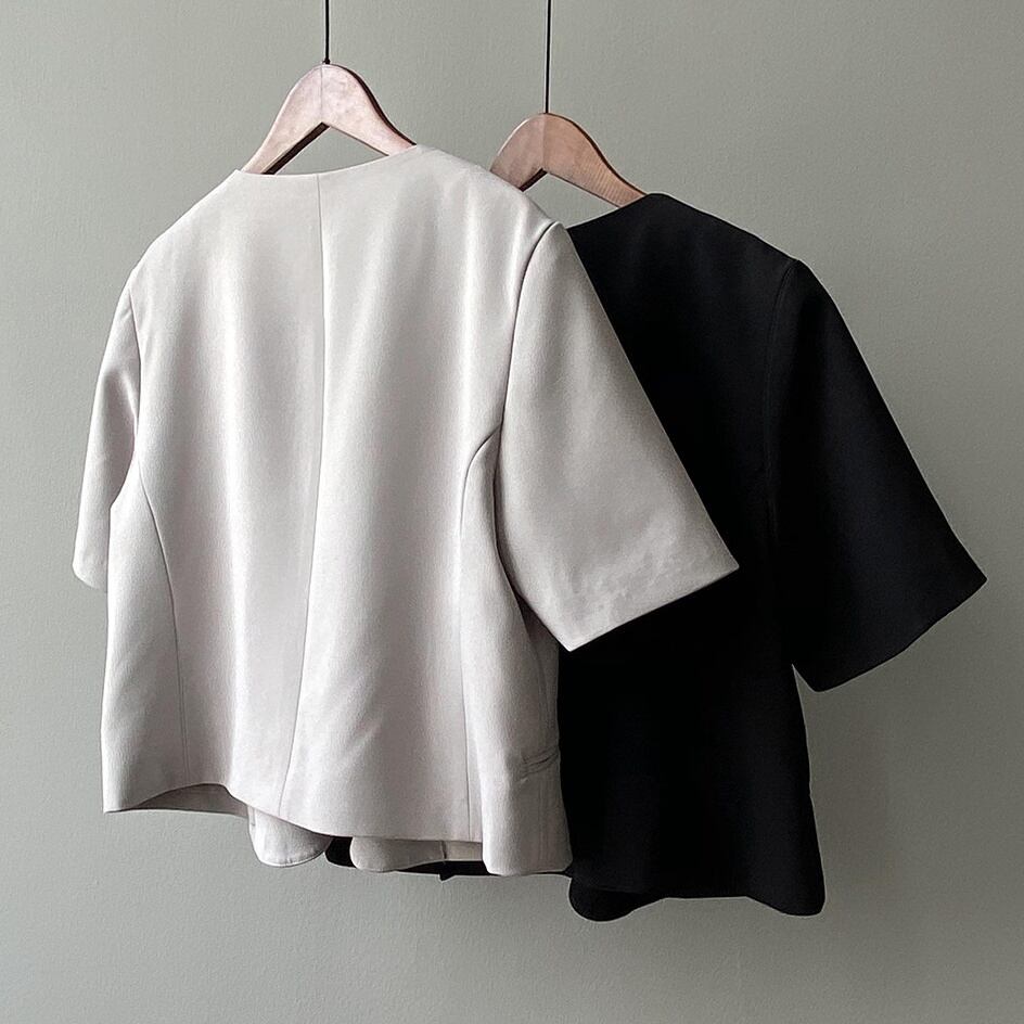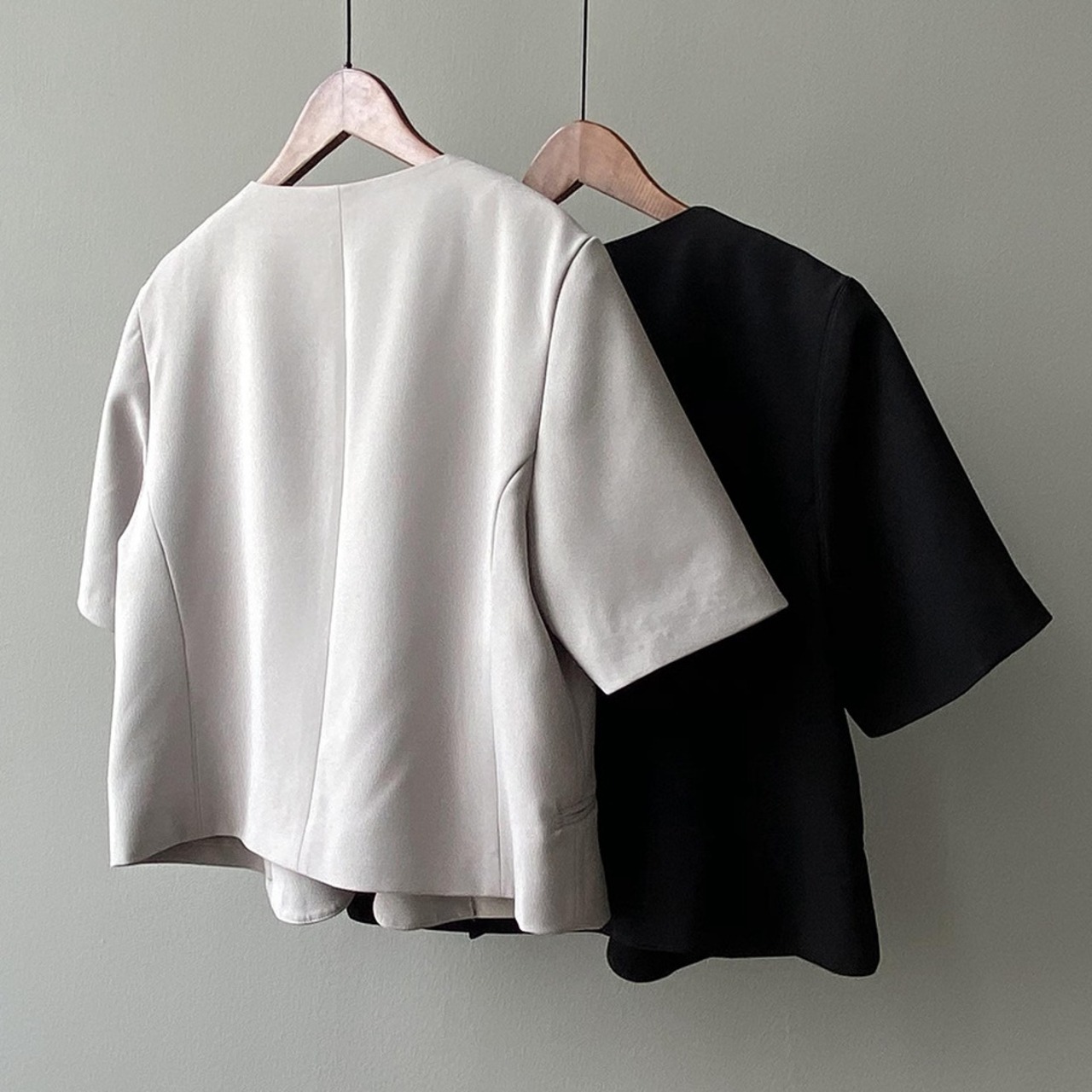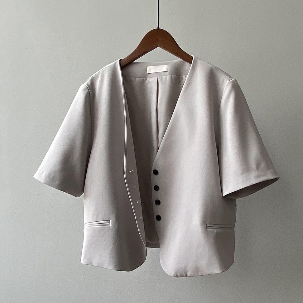 アウター レディース ジャケット 半袖 秋 スリム ストレート Iライン かわいい 大人可愛い きれいめ シンプル カジュアル 大人 上品 おしゃれ お洒落 レトロ 大人可愛い 大人女子 こなれ感 ラフ 存在感 フォーマル Vネック 袖あり 黒 ブラック 灰色 グレー くすみカラー M L 20代 30代 オフィス ビジネス OL 通勤 学生 通学 デート お出かけ 女子会 休日 着回し 普段使い 韓国 韓国系 オルチャン ファッション コーデ 楽ちん プチプラ 安い 送料無料 トレンド 流行 | Rena 韓国ファッション レディースアパレル