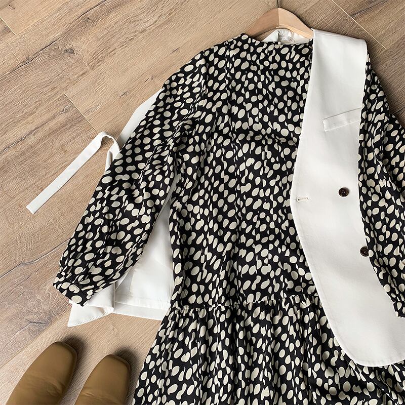 ワンピース レディース フレアワンピース Aラインワンピース ミモレ丈 長袖 柄 ドット 水玉 スリム Aライン かわいい 大人可愛い きれいめ シンプル カジュアル 大人 上品 おしゃれ レトロ Uネック ミモレ 袖あり 白 ホワイト 黒 ブラック M L ゆったり 20代 30代 女の子 通勤 学生 通学 デート お出かけ 女子会 休日 イベント 着回し 普段使い 韓国 韓国系 オルチャン ファッション コーデ スタイル 楽ちん モテ 送料無料 トレンド 流行 インスタ映え