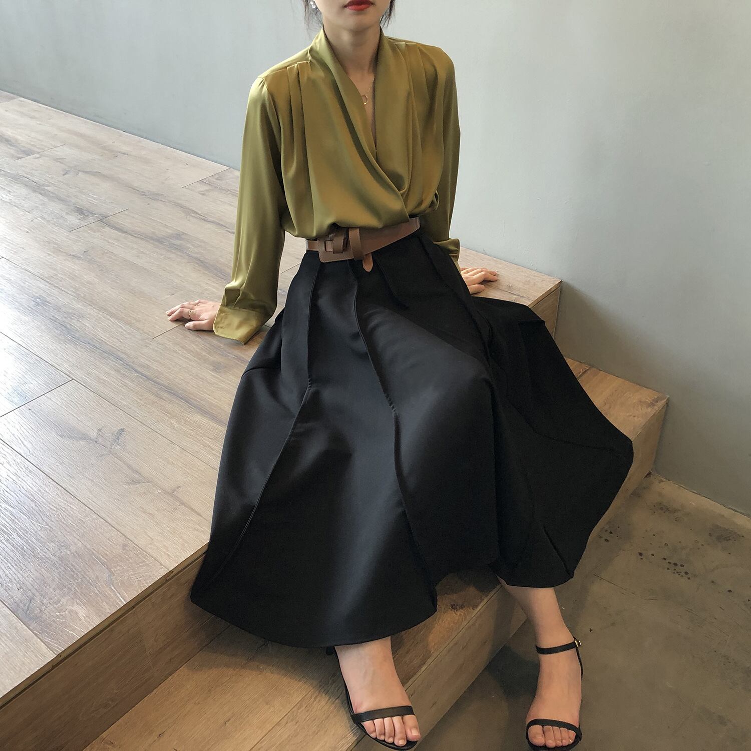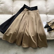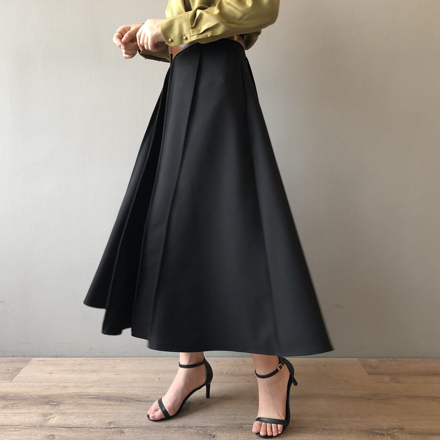 きれいなシルエットを作るAラインスカートに、光沢のある生地を使ってさらに美しい印象を与えます。