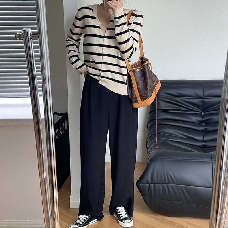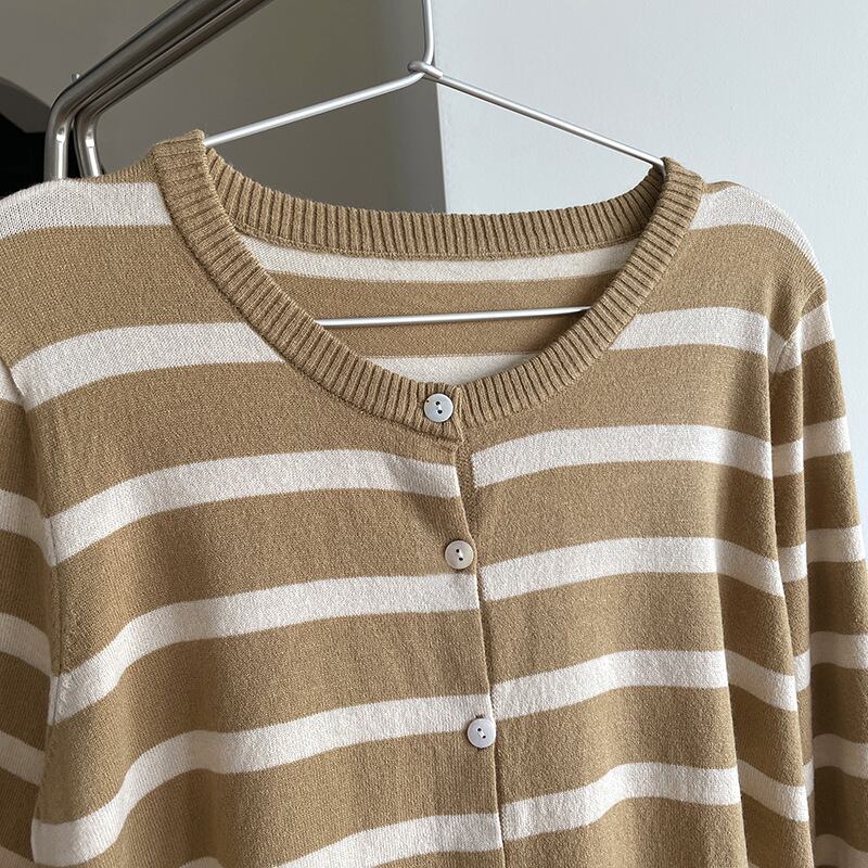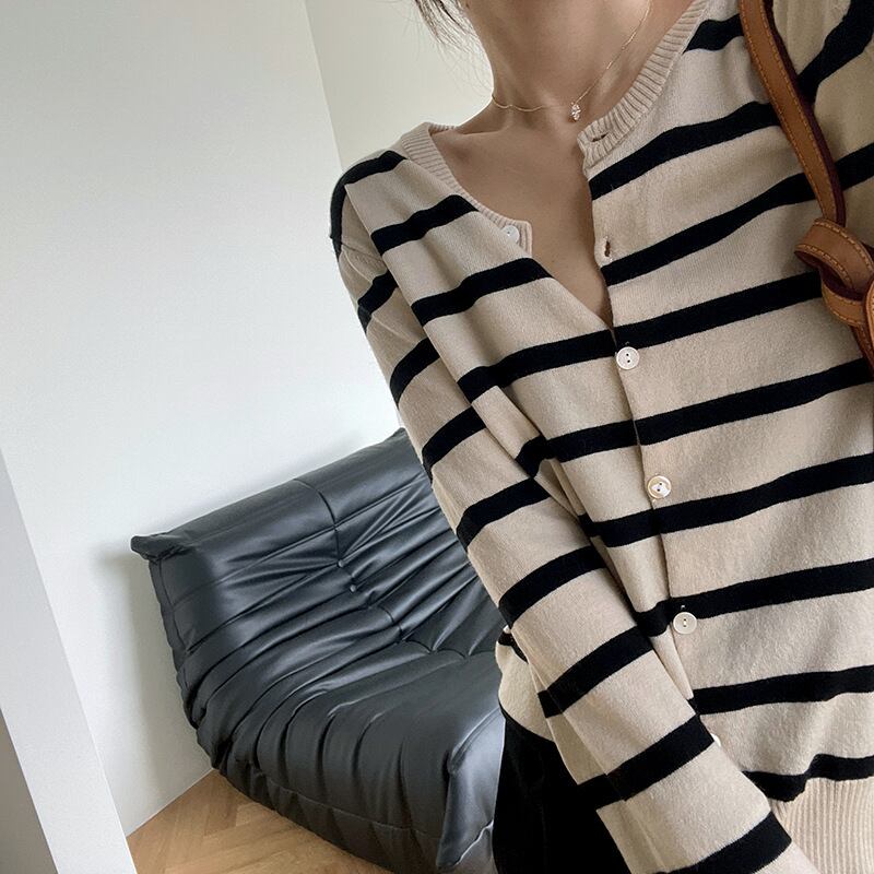 カーディガン 長袖 柄 ストライプ 春 秋 スリム ストレート 伸縮性 かわいい 大人可愛い きれいめ シンプル カジュアル 大人 上品 おしゃれ お洒落 かっこいい レトロ 大人可愛い 大人女子 個性的 とろみ感 抜け感 Vネック 袖あり くすみカラー 大人カラー ワンサイズ 20代 30代 オフィス ビジネス OL 通勤 学生 通学 デート お出かけ 公園デビュー 休日 着回し 普段使い 韓国 韓国系 オルチャン ファッション コーデ スタイル モテ 送料無料 トレンド 流行 インスタ映え | Rena 韓国ファッション レディースアパレル
