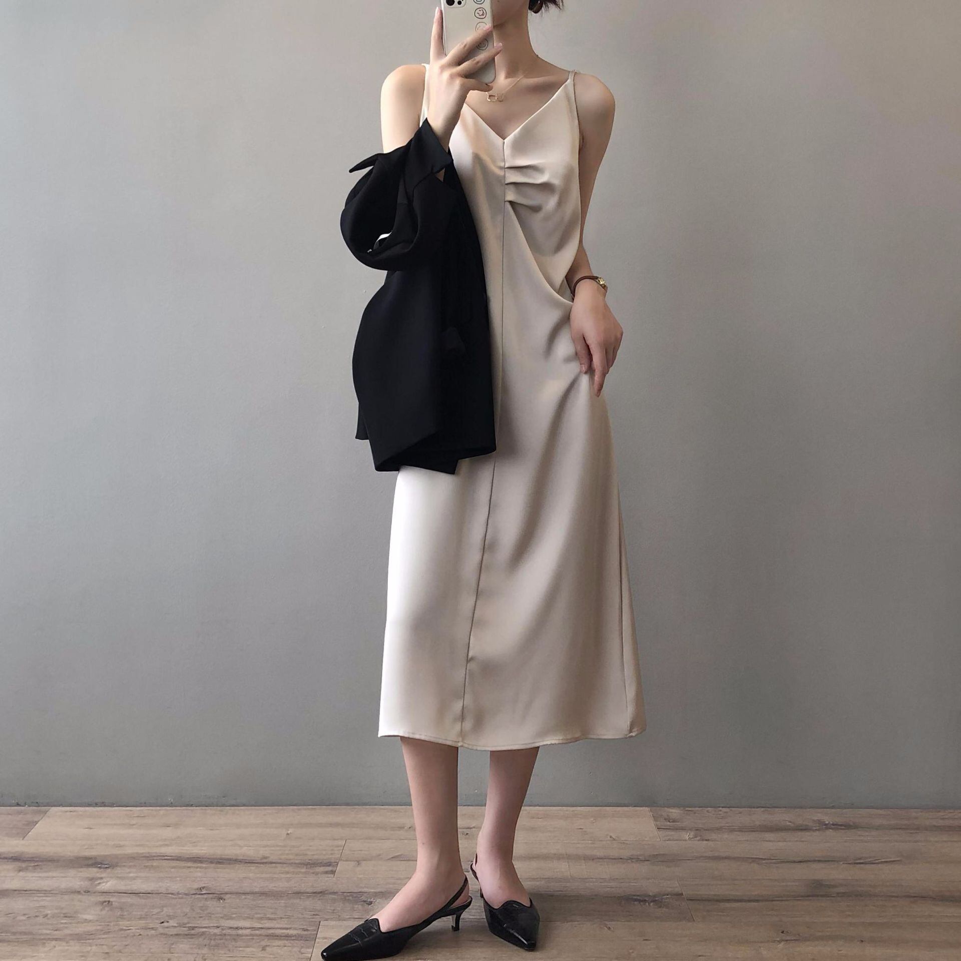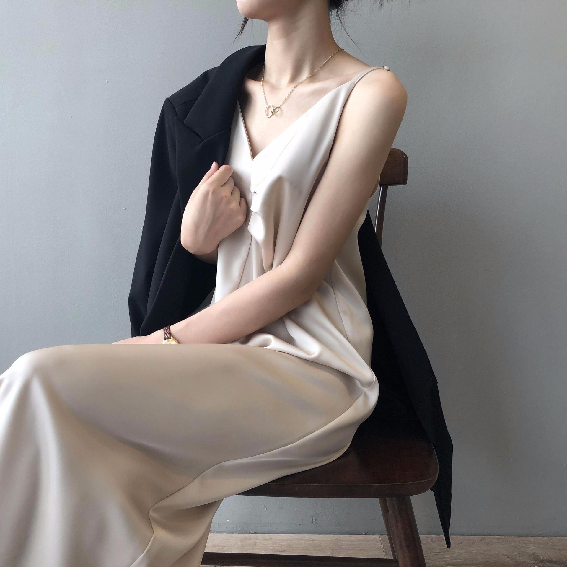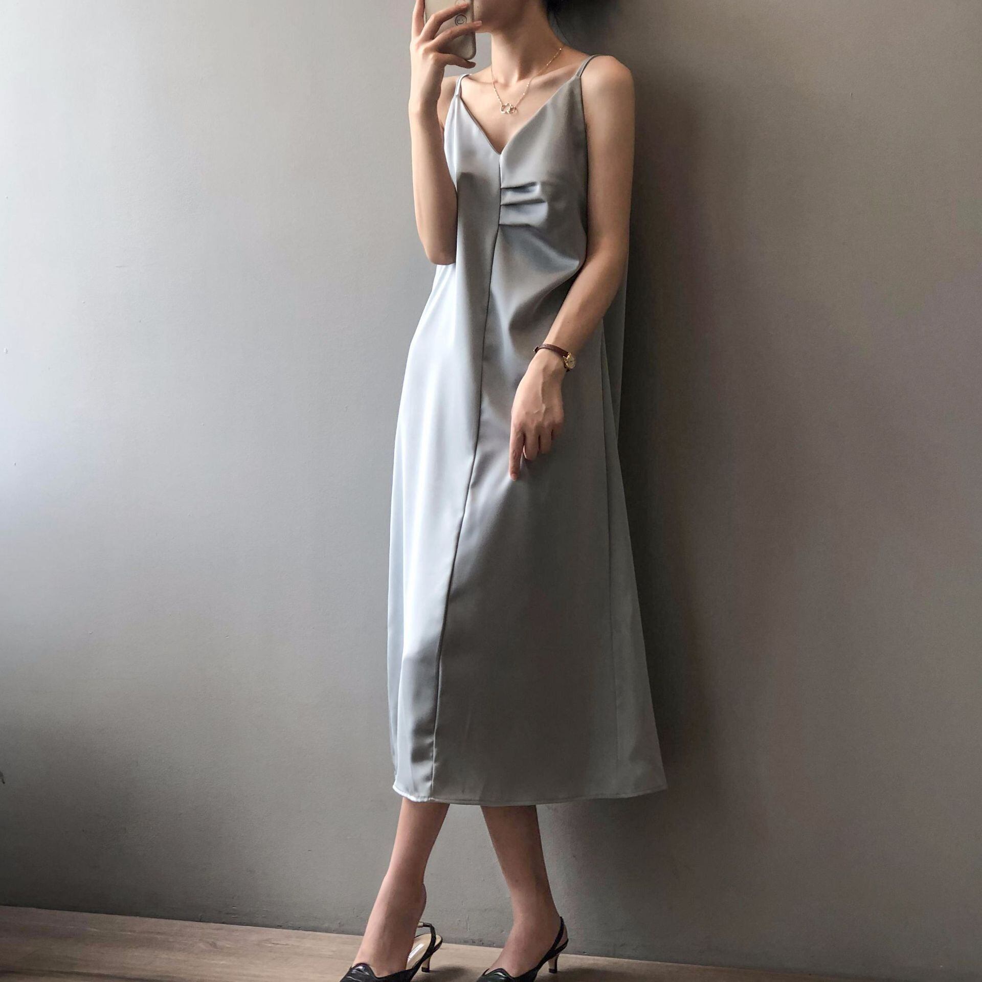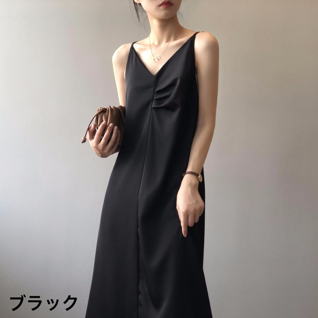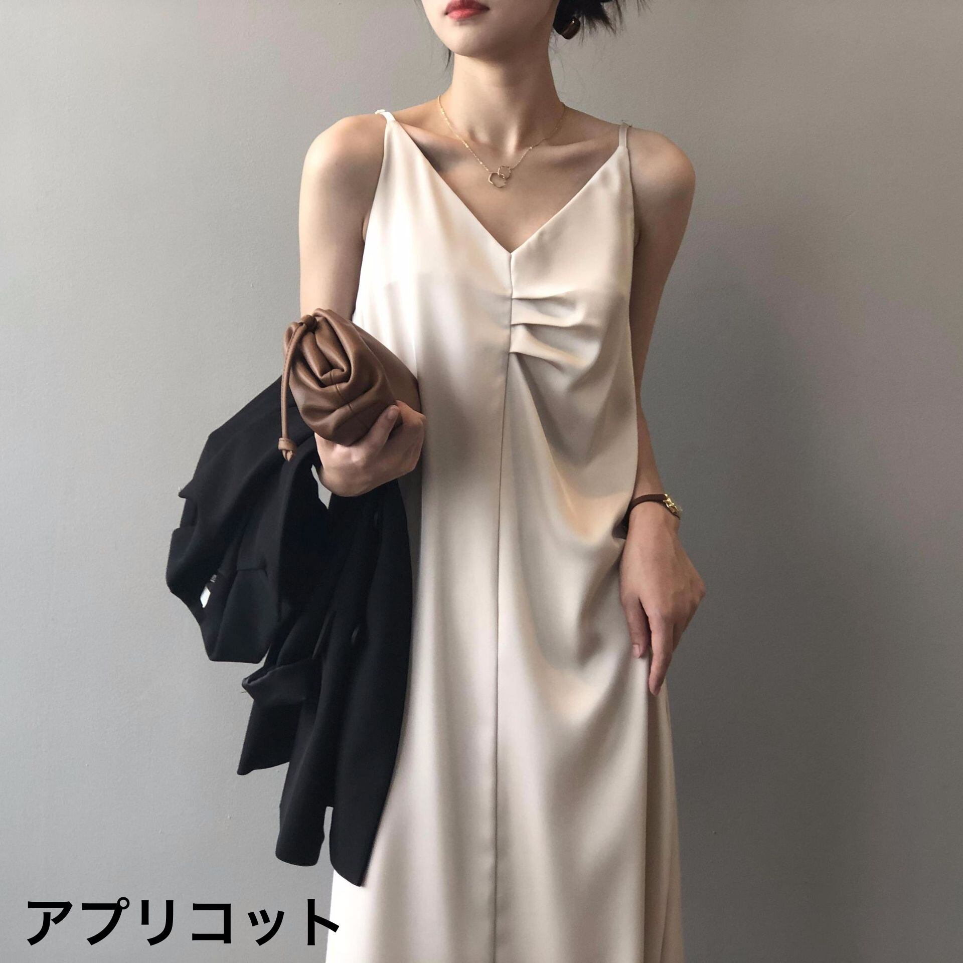 ワンピース レディース キャミソール ミモレ丈 ノースリーブ 無地 夏 秋 スリム ストレート Iライン かわいい 大人可愛い きれいめ シンプル カジュアル 大人 上品 おしゃれ お洒落 大人可愛い こなれ感 Vネック ミモレ 袖なし 黒 ブラック 青 ブルー くすみカラー 大人カラー アプリコット M L 20代 30代 女性用 オフィス ビジネス OL 通勤 学生 デート お出かけ 女子会 着回し 普段使い 韓国 韓国系 オルチャン コーデ 楽ちん モテ 送料無料 トレンド 流行 インスタ映え | Rena 韓国ファッション レディースアパレル