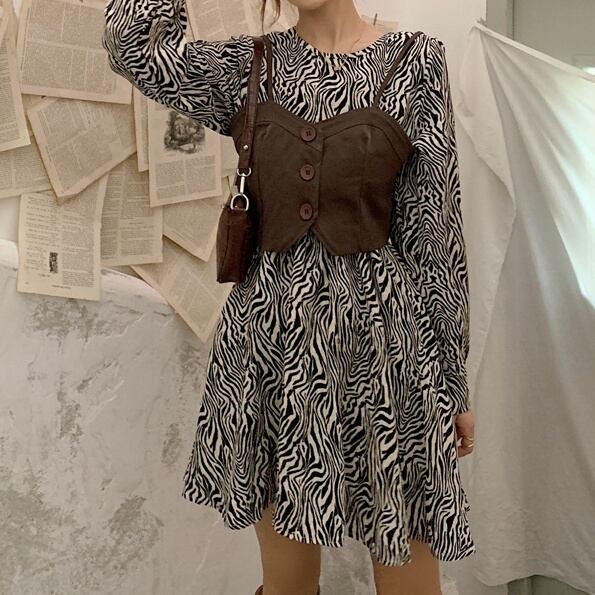 ゼブラ柄のワンピースに大人っぽいシックなカラーのベストを合わせることで、ファッション全体のシルエットを引き締めてくれます。