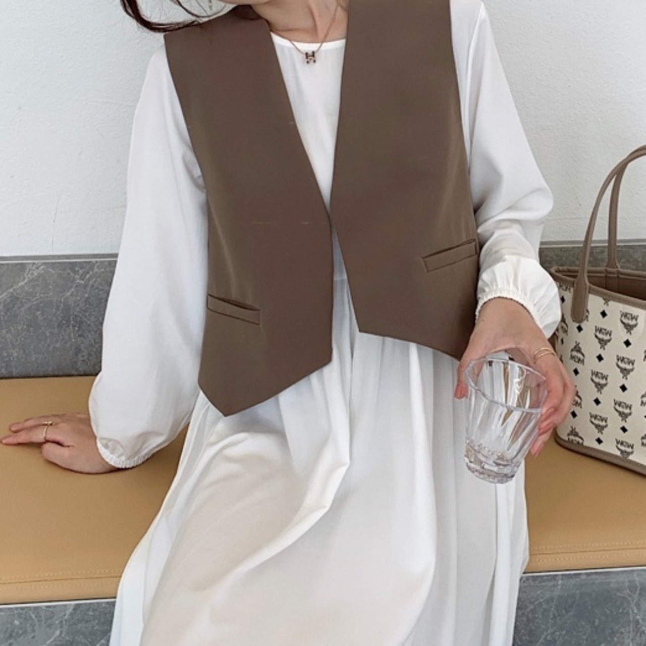 ホワイトのワンピースと落ち着いたカラーのチョッキベストの組み合わせです。