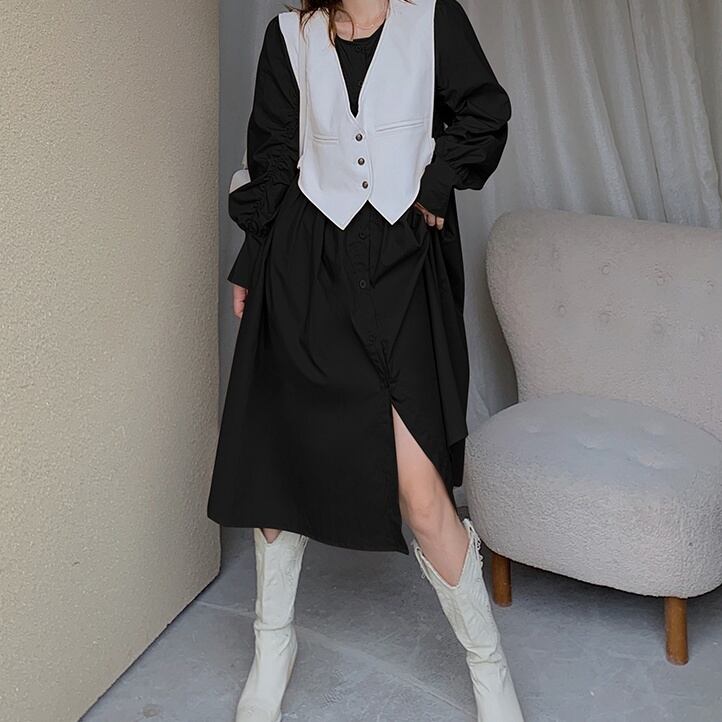 ベスト+マスタードワンピース/ベスト+ブラックワンピース