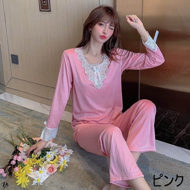 パジャマ レディース ロング丈 長袖 春 秋 レース リボン かわいい 大人可愛い きれいめ 大人 上品 おしゃれ お洒落 大人女子 キュート ガーリー セクシー エレガント 主役級 存在感 ロング 袖あり 部屋着 寝巻き ナイトウェア ポリエステル 上下セット ツーピース 赤 レッド 青 ブルー ピンク M L XL 2XL 10代 20代 30代 女性用 お泊まり 旅行 普段使い スタイル 楽ちん モテ 送料無料