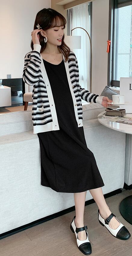 ワンピース カーディガン キャミソールワンピース ミモレ丈 長袖 ボーダー 春 夏 秋 冬 フレア セミフレア ワイド Aライン かわいい 大人可愛い きれいめ シンプル カジュアル 大人 上品 おしゃれ お洒落 大人可愛い 大人女子 こなれ感 ラフ ラブリー キュート ガーリー Uネック ミモレ 袖あり 2点セット 白 ホワイト 黒 ブラック モノトーン M L XL 2XL ゆったり 20代 30代 40代 女性用 ママ マタニティ デート お出かけ 休日 オールシーズン 着回し 普段使い | Rena 韓国ファッション レディースアパレル