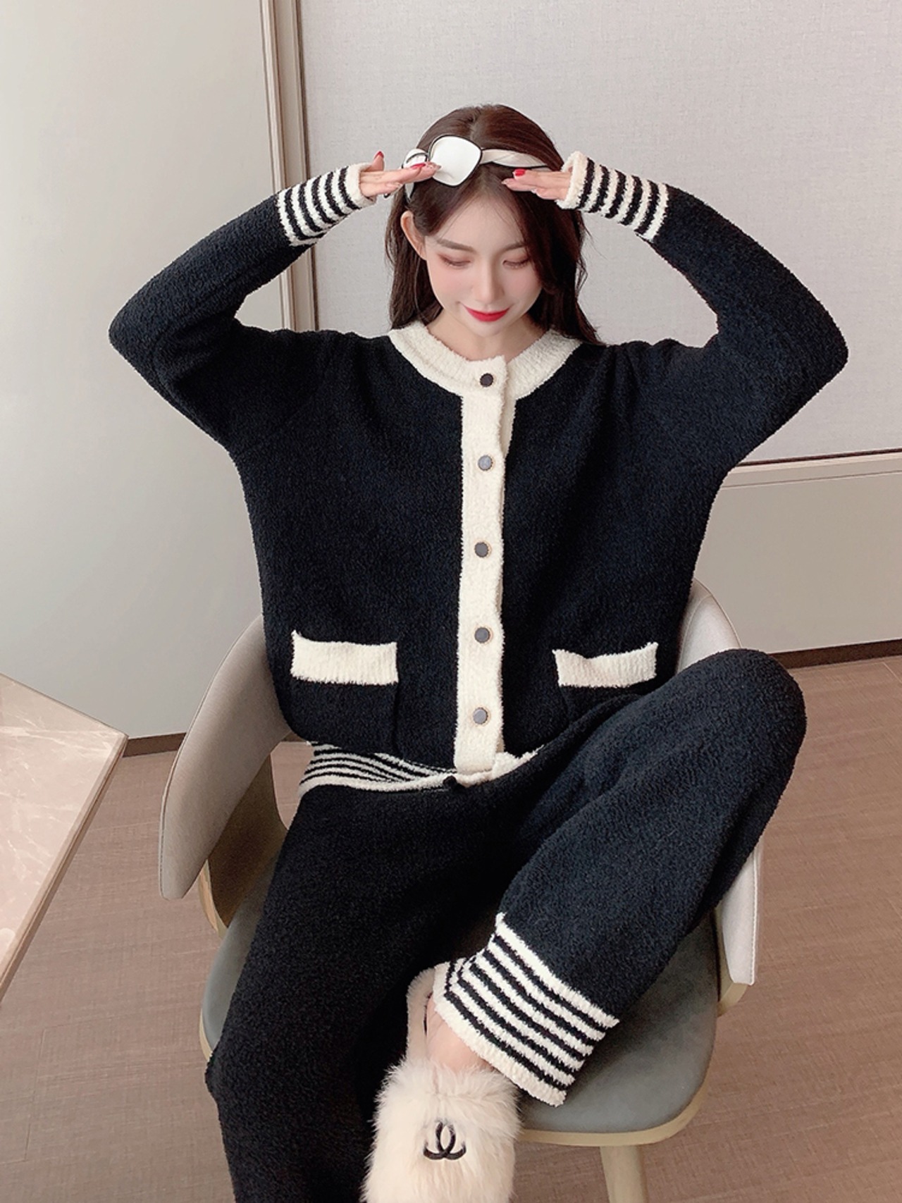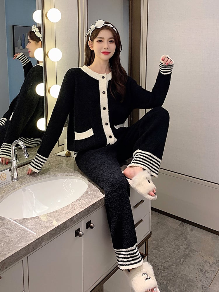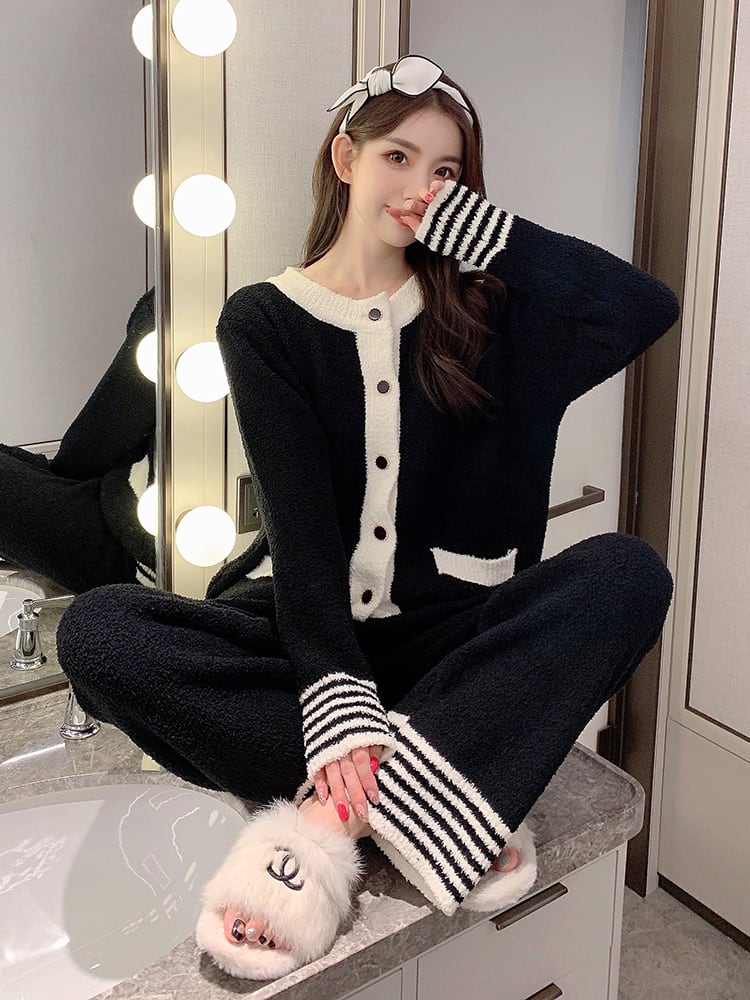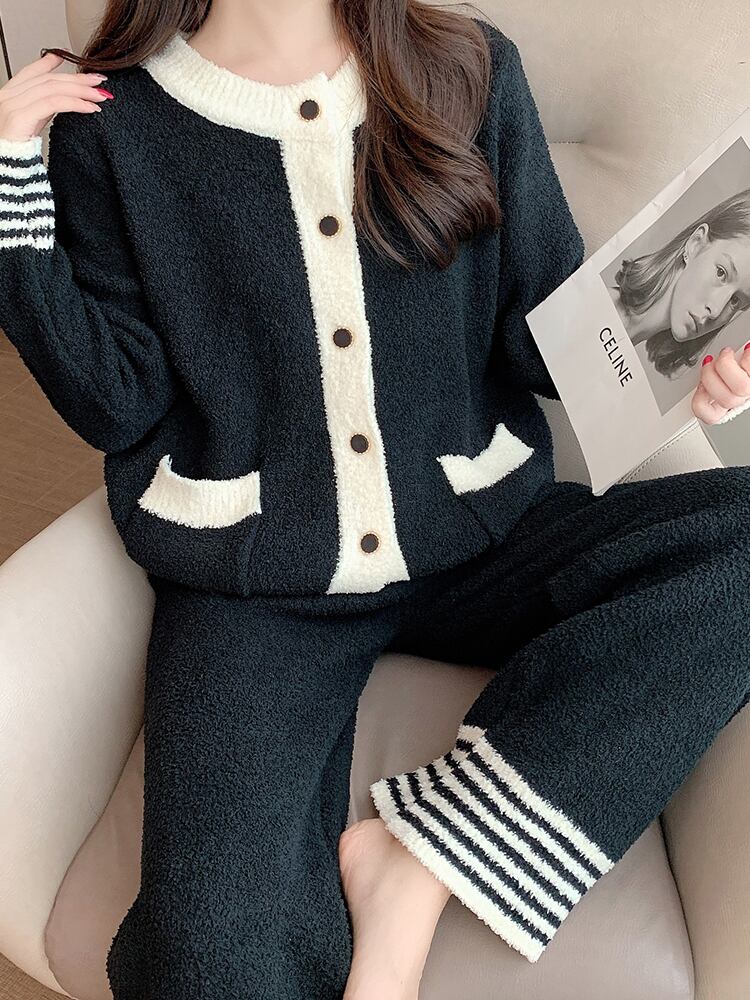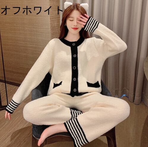 パジャマ レディース 長袖 春 秋 冬 もこもこ ふわふわ ポケット 前開き かわいい おしゃれ 大人可愛い ラブリー キュート ガーリー 部屋着 寝巻き ナイトウェア 上下セット 2点セット ホワイト ブラック フリーサイズ 女性用 お泊まり 楽ちん あったか モテ インスタ映え ゆったり | Rena 韓国ファッション レディースアパレル