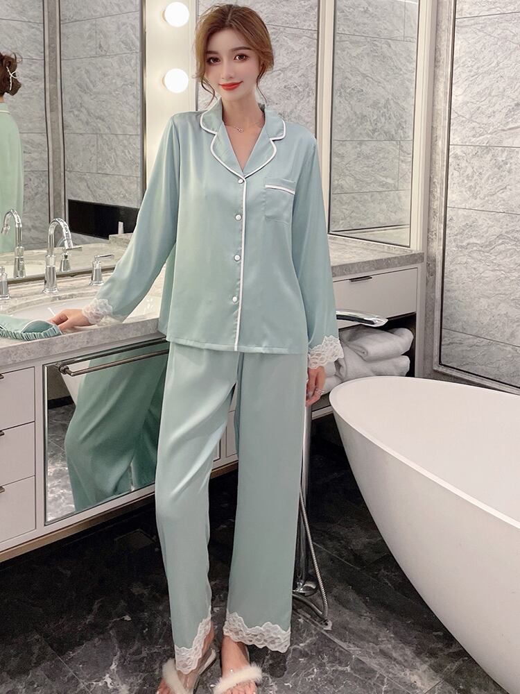 パジャマ レディース 長袖 無地 春 夏 秋 冬 レース 前開き 大人可愛い きれいめ シンプル 上品 おしゃれ 大人女子 セクシー 部屋着 寝巻き ナイトウェア 上下セット 3点セット ブルー ピンク S M L 20代 30代 40代 50代 60代 女性用 お泊まり 韓国系 | Rena 韓国ファッション レディースアパレル