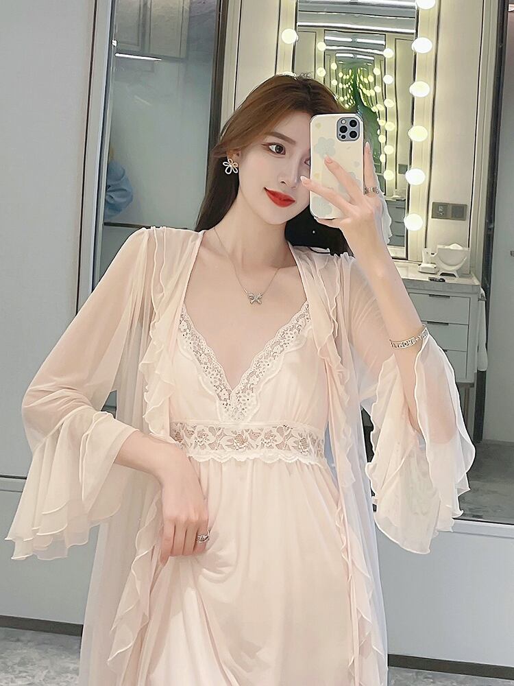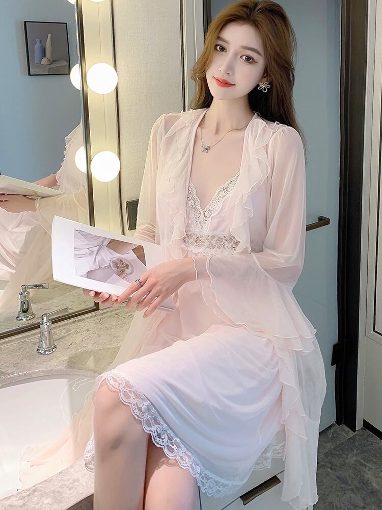 ルームウェア レディース 膝上 無地 裾フレア レース チュール 透け感 シースルー 大人可愛い きれいめ 上品 おしゃれ お洒落 大人女子 ラブリー キュート ガーリー セクシー ひざ丈 7分袖 フレアスリーブ 部屋着 ナイトウェア ネグリジェ 2点セット ホワイト ピンク M L 10代 20代 30代 女性用 お泊まり 休日 韓国系 モテ インスタ映え | Rena 韓国ファッション レディースアパレル