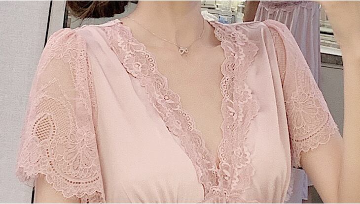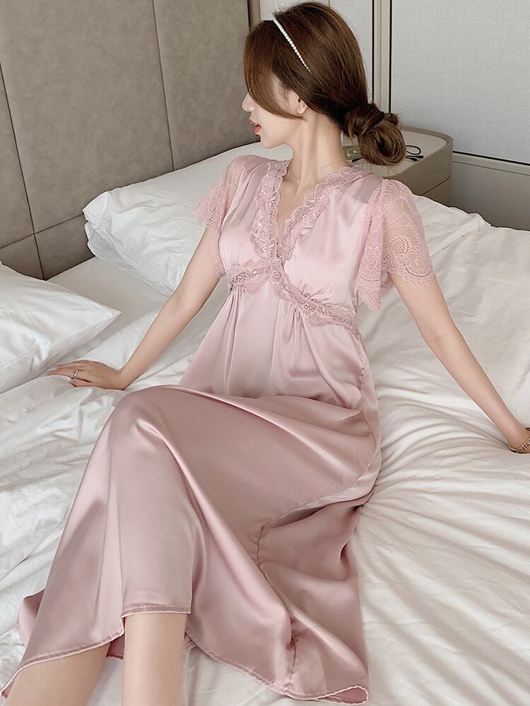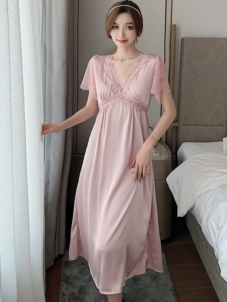 ルームウェア レディース ひざ下 半袖 無地 春 夏 秋 セミフレア Aライン レース シフォン 透け感 大人可愛い きれいめ シンプル 上品 おしゃれ お洒落 大人女子 ラブリー キュート ガーリー セクシー とろみ感 Vネック ひざ丈 袖あり 部屋着 寝巻き ナイトウェア ネグリジェ ブラウン ピンク M L XL 20代 30代 40代 50代 60代 女性用 お泊まり 休日 韓国系 楽ちん モテ | Rena 韓国ファッション レディースアパレル