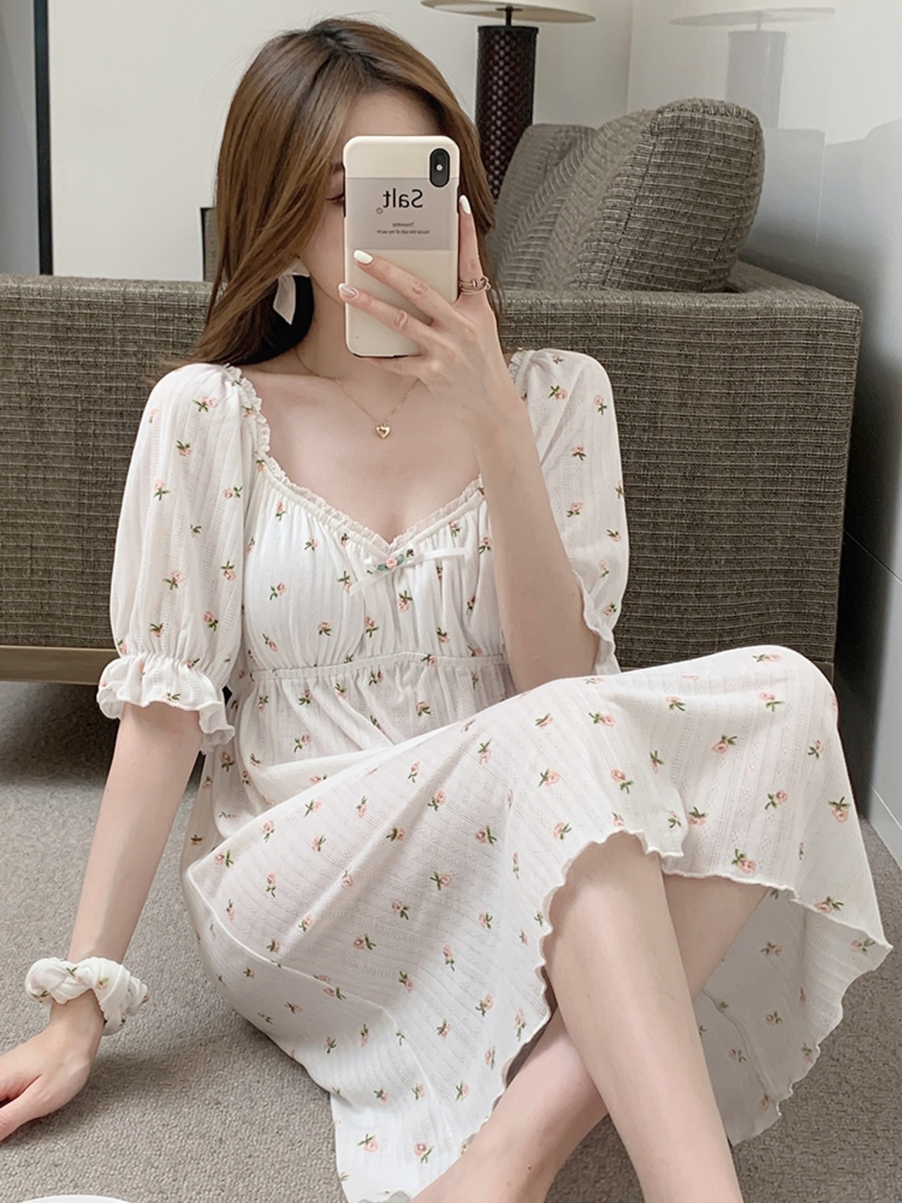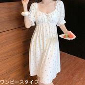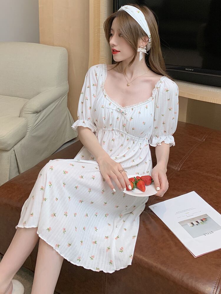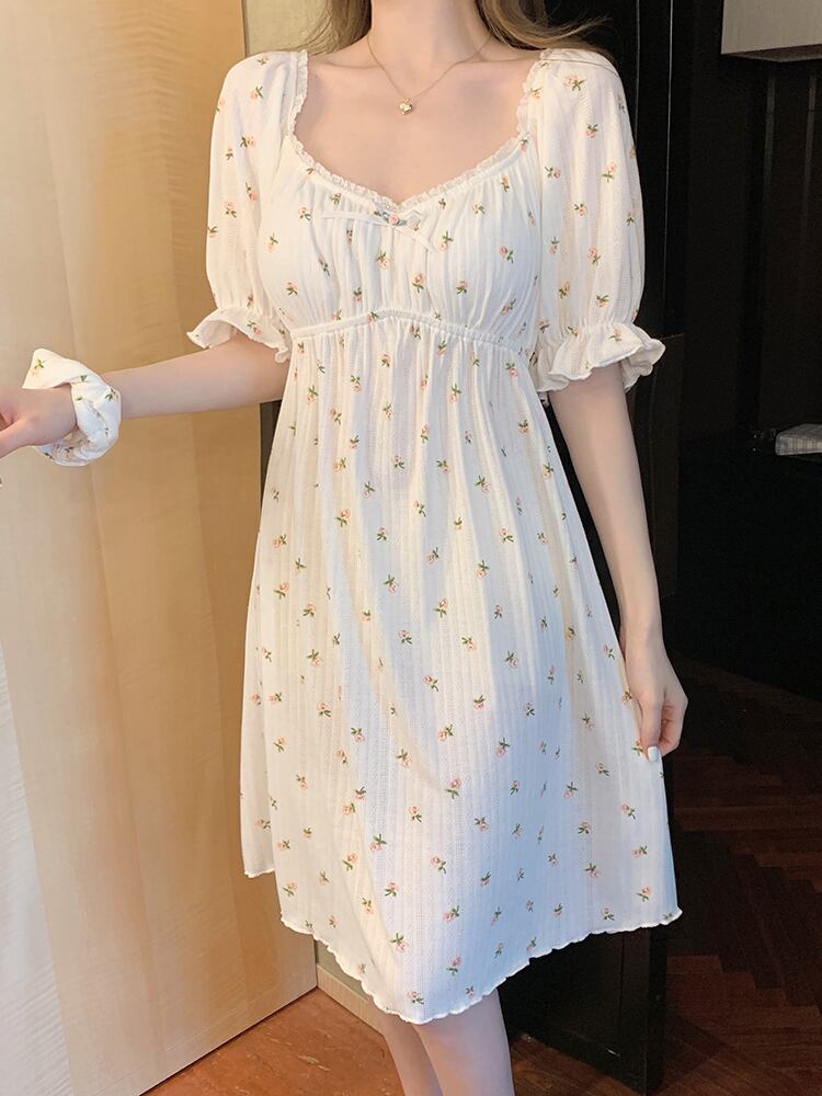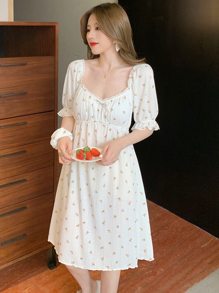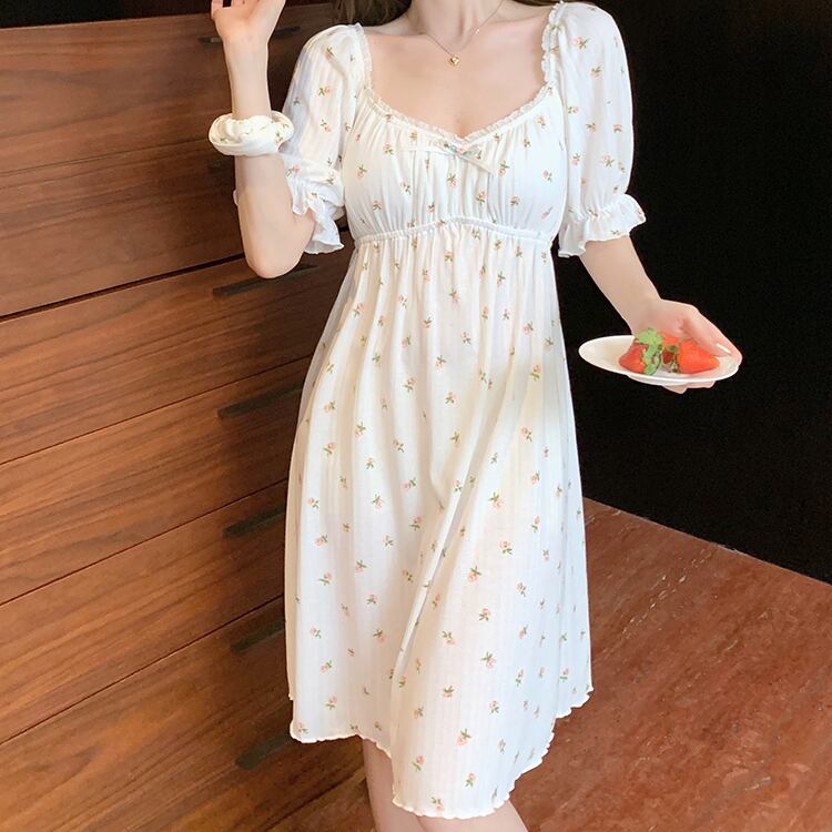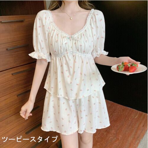 ルームウェア レディース 膝丈 半袖 小花柄 春 夏 Aライン かわいい 大人可愛い ラブリー キュート ガーリー Vネック ショート ひざ丈 袖あり パフスリーブ 部屋着 寝巻き ナイトウェア 2点セット ツーピース ホワイト S M L XL 10代 20代 30代 女性用 お泊まり 休日 普段使い 韓国 韓国系 モテ ゆったり | Rena 韓国ファッション レディースアパレル
