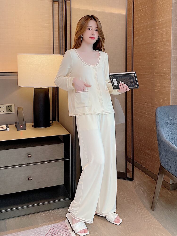 パジャマ レディース 長袖 無地 春 夏 秋 冬 レース ポケット 前開き かわいい 大人可愛い きれいめ シンプル 大人女子 ラフ ラブリー キュート ガーリー ラウンドネック 部屋着 寝巻き ナイトウェア 薄手 2点セット ホワイト オフホワイト S M L 10代 20代 30代 40代 50代 60代 女性用 ママ お泊まり 普段使い 楽ちん モテ | Rena 韓国ファッション レディースアパレル