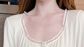 大きくあいたラウンドネックの首もとに、縁にあしらったレースが、女性らしく上品な印象を与えます。