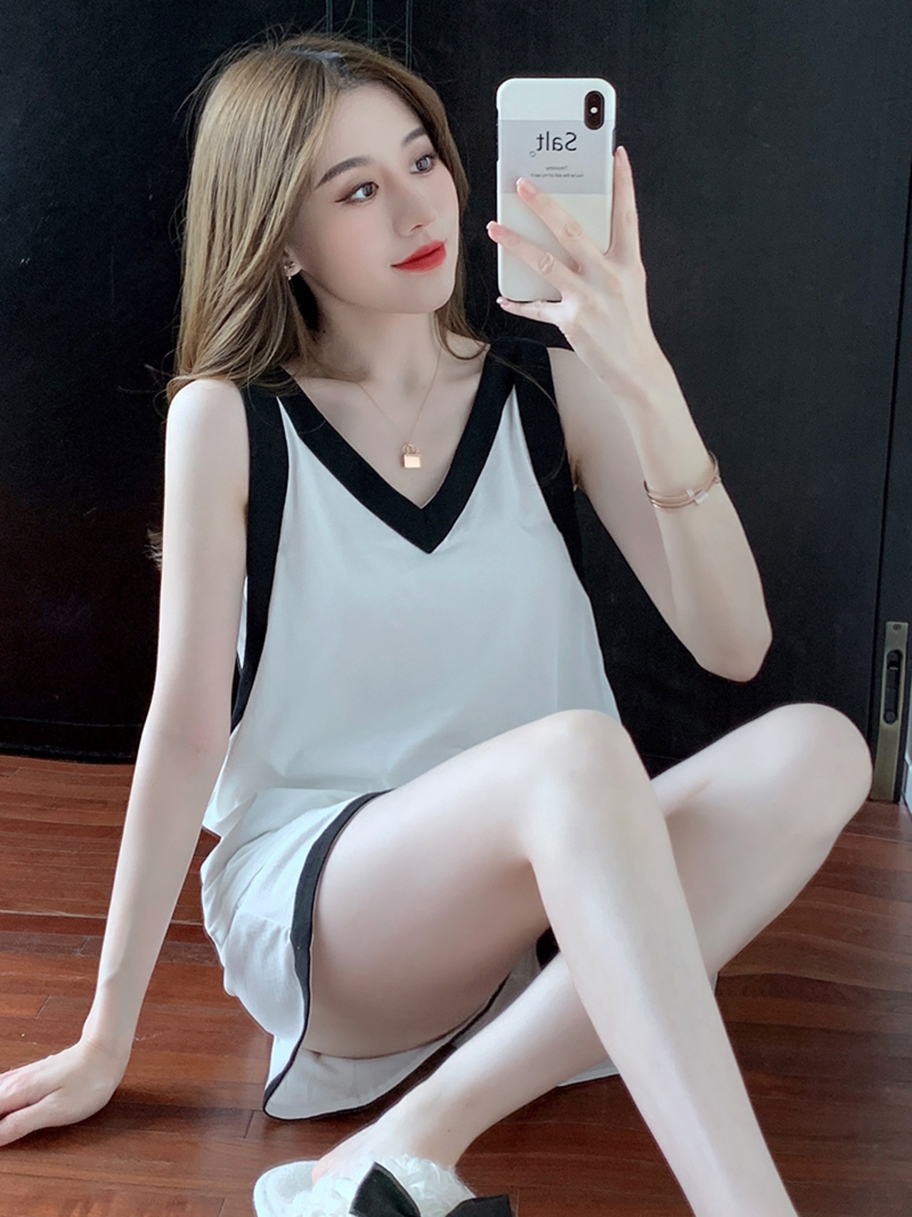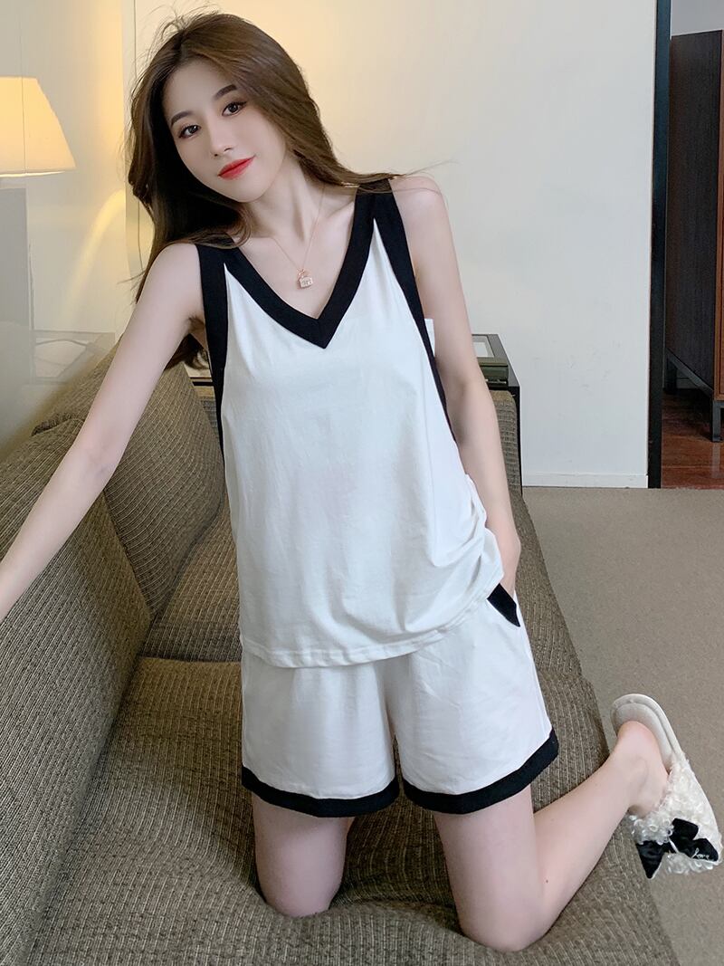 パジャマ レディース ショート丈 ノースリーブ 無地 夏 ポケット かわいい シンプル カジュアル おしゃれ ラフ メンズライク ボーイッシュ スポーティー Vネック ショート 袖なし 部屋着 寝巻き ナイトウェア 上下セット 2点セット ホワイト ブラック S M L XL 10代 20代 30代 女性用 お泊まり 休日 普段使い 楽ちん | Rena 韓国ファッション レディースアパレル