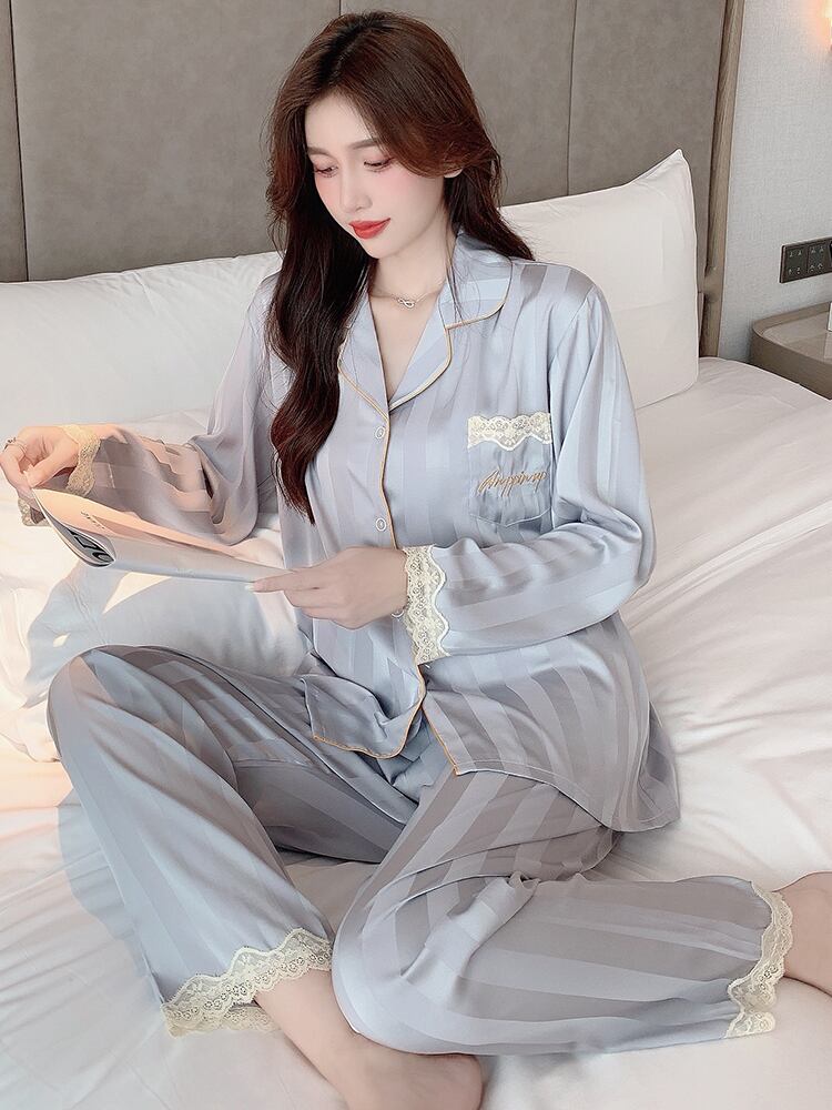 パジャマ レディース 長袖 ストライプ 春 夏 秋 冬 レース ポケット 前開き かわいい 大人可愛い きれいめ シンプル 大人 上品 おしゃれ お洒落 大人女子 ラブリー キュート ガーリー Vネック 襟付き 袖あり 部屋着 寝巻き ナイトウェア 上下セット 2点セット グレー シルバー M L XL 10代 20代 30代 40代 50代 60代 女性用 お泊まり 休日 普段使い 楽ちん