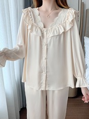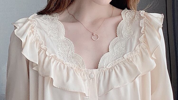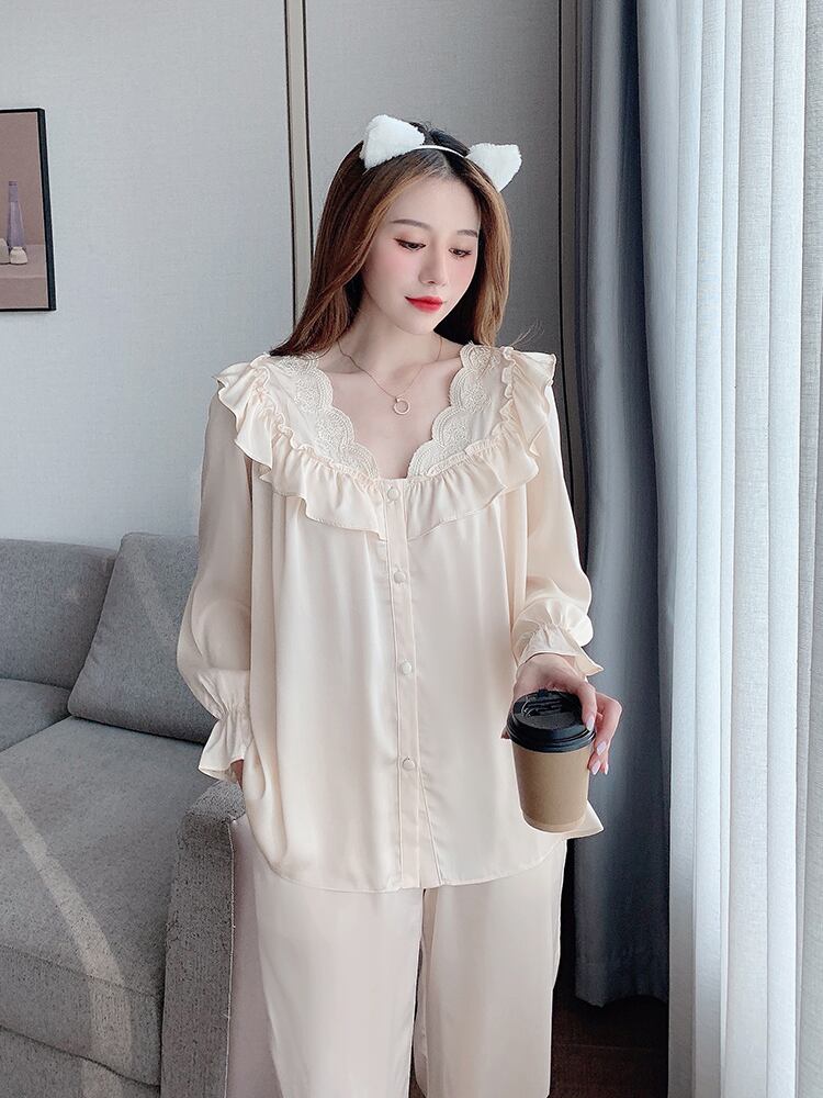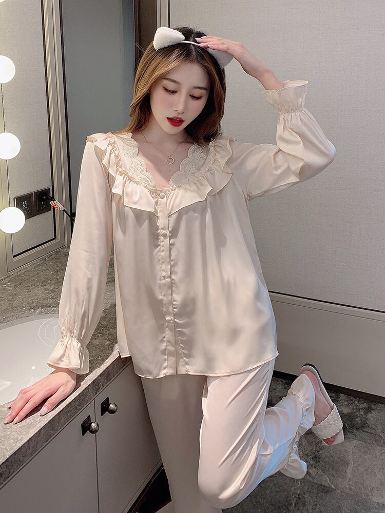パジャマ レディース 長袖 無地 春 夏 秋 裾フレア レース フリル 前開き かわいい 大人可愛い きれいめ ラブリー キュート ガーリー Vネック 襟付き 袖あり 部屋着 寝巻き ナイトウェア 上下セット 2点セット オフホワイト ピンク S M L XL 10代 20代 30代 40代 50代 60代 女性用 ママ お泊まり 休日 普段使い 楽ちん | Rena 韓国ファッション レディースアパレル