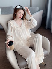 パジャマ レディース 長袖 無地 春 夏 秋 裾フレア レース フリル 前開き かわいい 大人可愛い きれいめ ラブリー キュート ガーリー Vネック 襟付き 袖あり 部屋着 寝巻き ナイトウェア 上下セット 2点セット オフホワイト ピンク S M L XL 10代 20代 30代 40代 50代 60代 女性用 ママ お泊まり 休日 普段使い 楽ちん