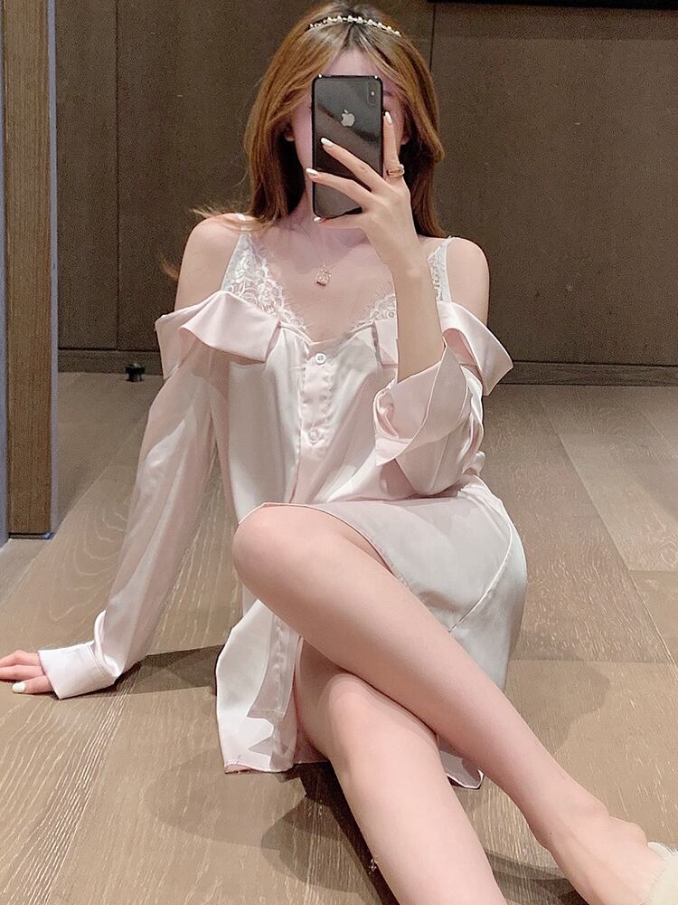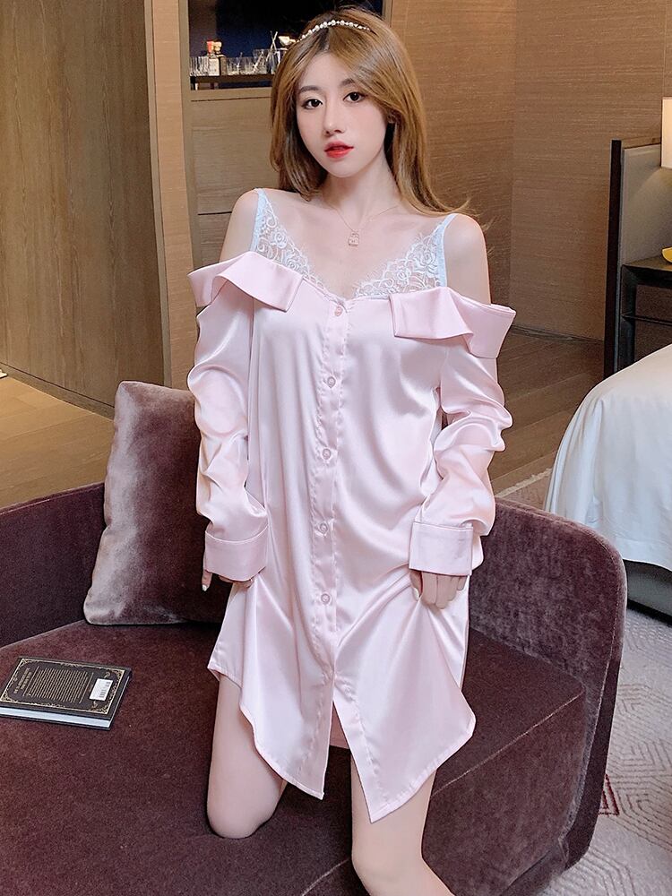 ルームウェア レディース シャツワンピース 膝上 長袖 無地 春 夏 秋 レース 前開き 大人可愛い きれいめ おしゃれ お洒落 大人女子 こなれ感 ラブリー キュート ガーリー セクシー オフショルダー ミニ ショート 部屋着 寝巻き ナイトウェア ホワイト ブラック ピンク フリーサイズ 10代 20代 30代 40代 50代 60代 女性用 お泊まり 休日 普段使い 韓国系 モテ | Rena 韓国ファッション レディースアパレル