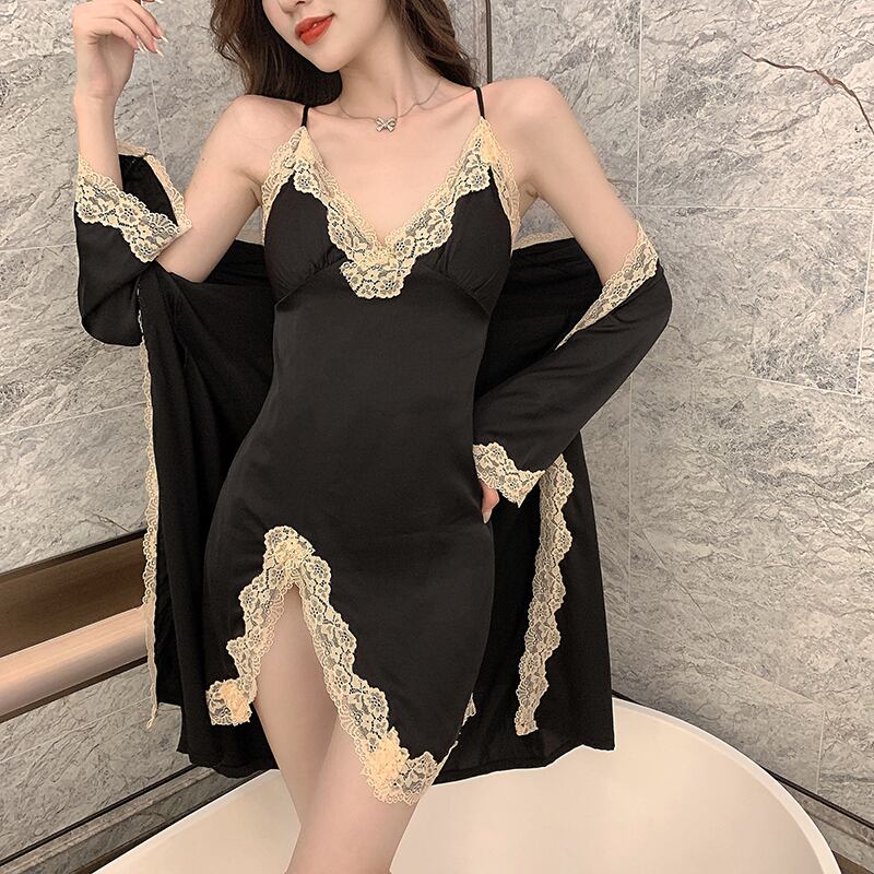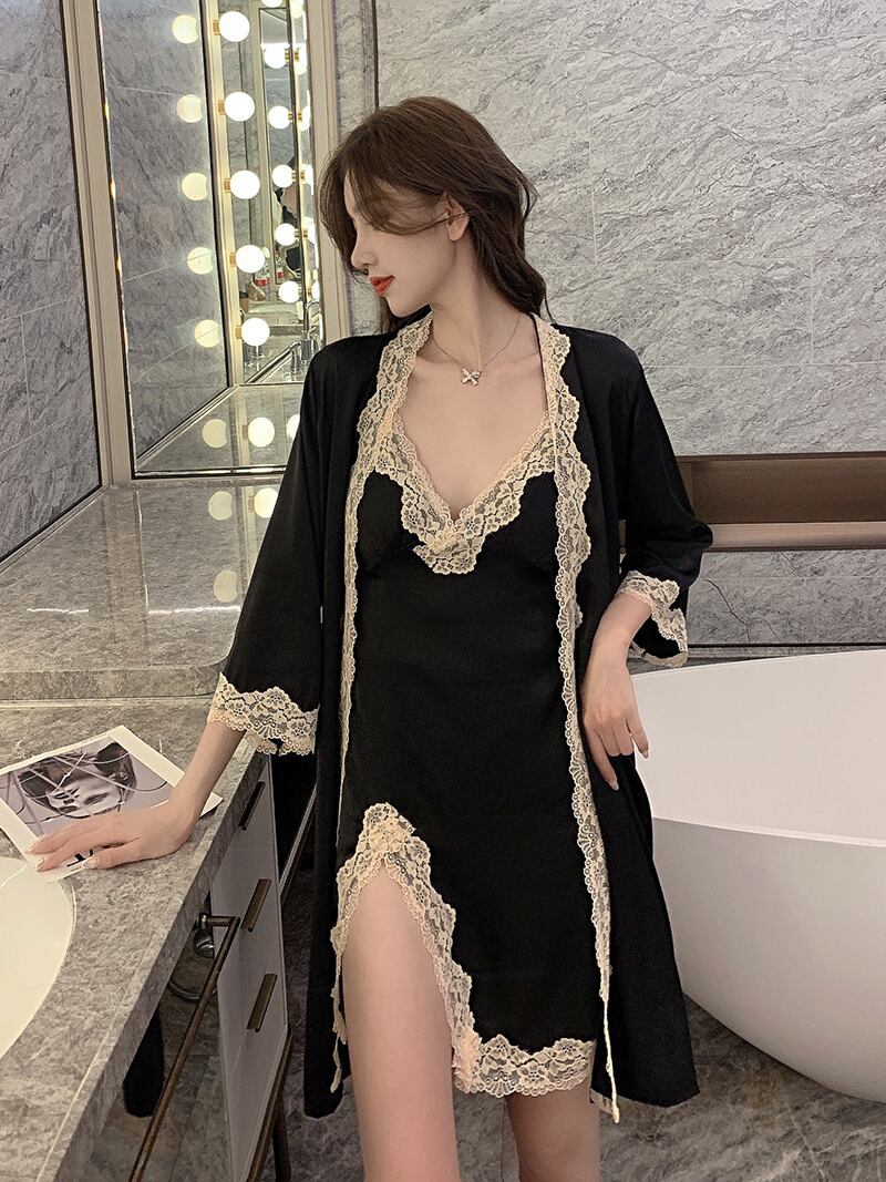 滑らかで肌触りの良い生地に、高級感あふれるレース素材が魅力的な、ナイトドレスとガウンのセットです。