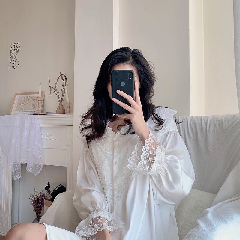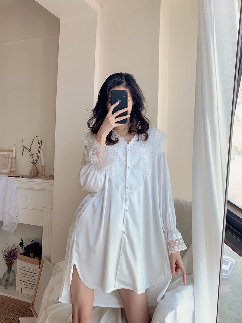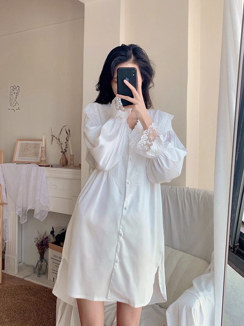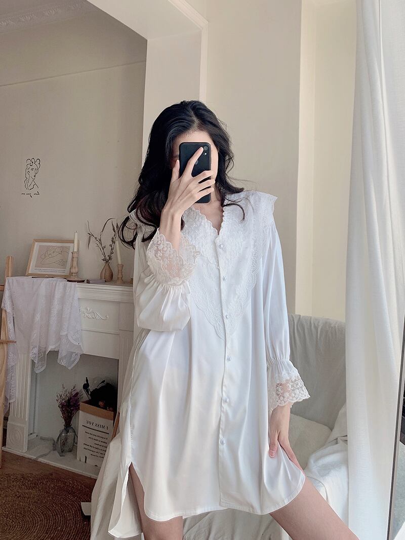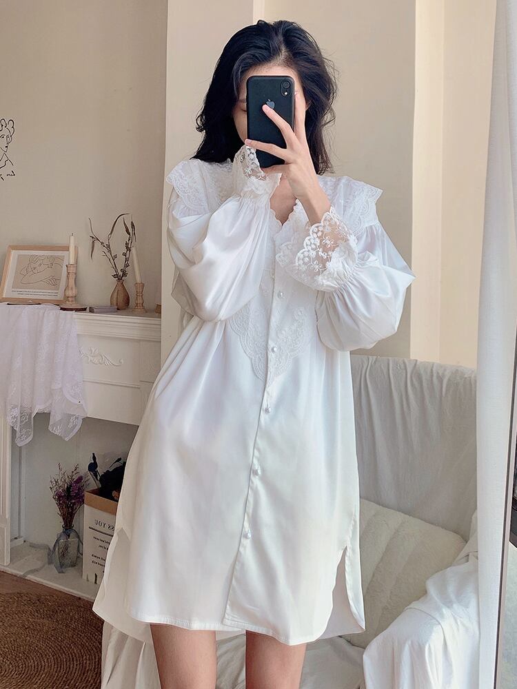 ルームウェア レディース シャツワンピース ショート丈 長袖 無地 春 夏 Iライン レース フリル 前開き かわいい きれいめ シンプル 大人可愛い ラブリー キュート ガーリー Vネック ショート 部屋着 寝巻き ナイトウェア ネグリジェ ホワイト フリーサイズ 10代 20代 30代 女性用 お泊まり 休日 普段使い 韓国 韓国系 楽ちん モテ ゆったり | Rena 韓国ファッション レディースアパレル