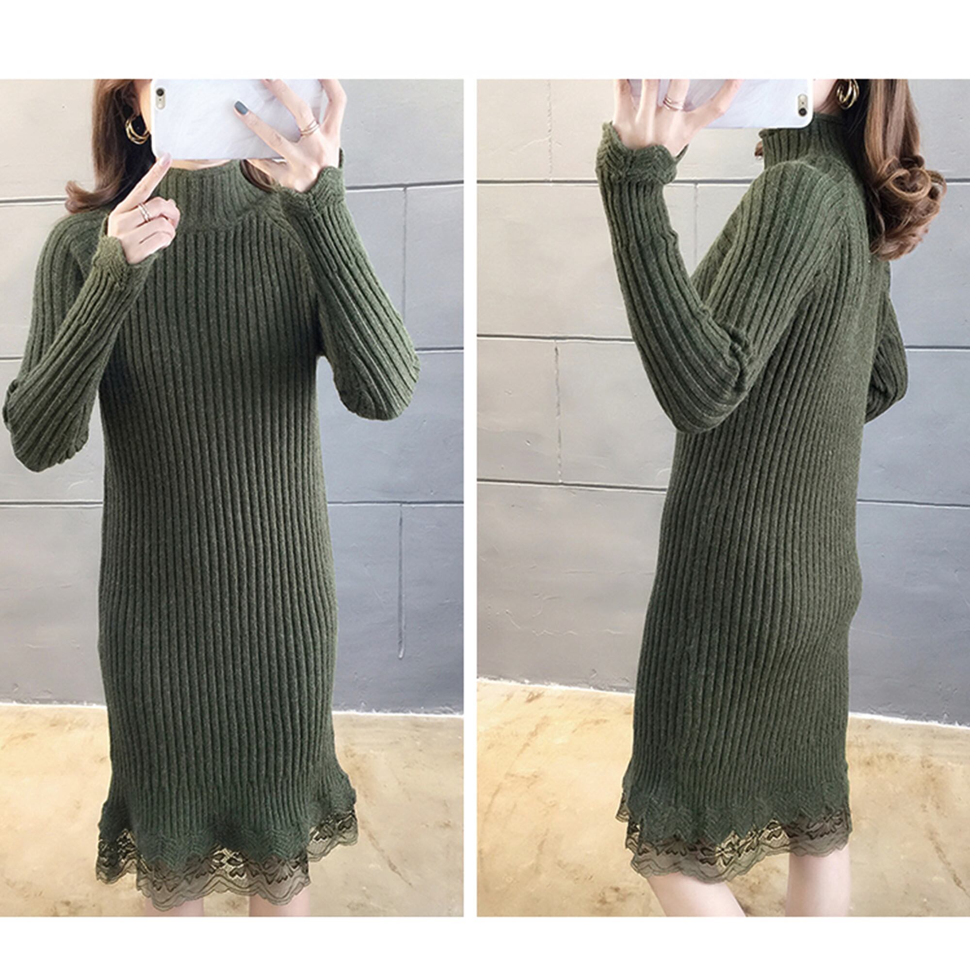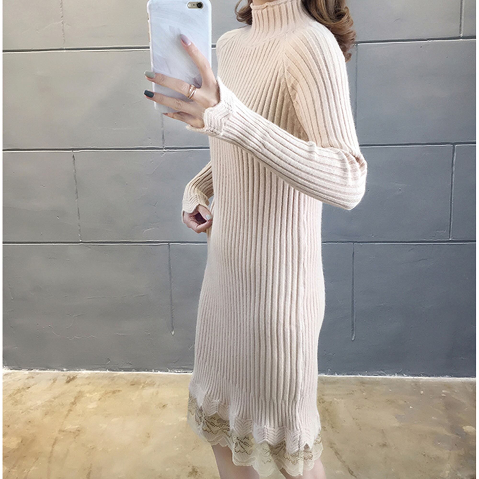ワンピース ニット 膝丈 長袖 無地 秋 冬 フレア レース 透け感 大人可愛い 上品 おしゃれ 大人女子 セクシー エレガント タートルネック ひざ丈 ボリューム袖 ニット 厚手 白 ホワイト 黒 ブラック 赤 レッド 茶色 ブラウン ベージュ カーキ S M L XL XXL OL 通勤 あったか 暖かい モテ | Rena 韓国ファッション レディースアパレル