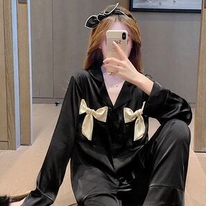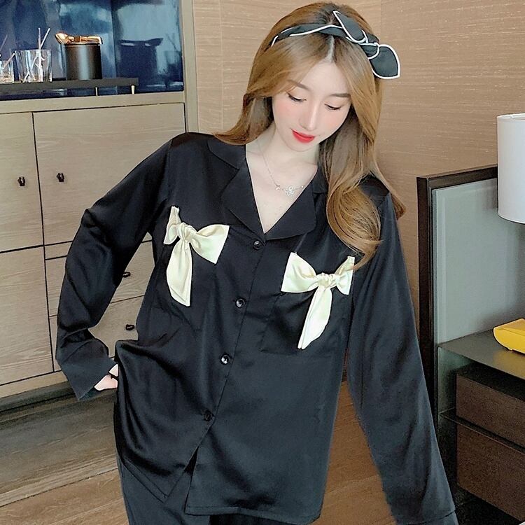 パジャマ レディース ロング丈 長袖 無地 春 夏 秋 冬 リボン 前開き かわいい 大人可愛い 大人女子 キュート 主役級 存在感 とろみ感 Vネック 襟付き 袖あり 部屋着 寝巻き ナイトウェア 薄手 上下セット ブラック ピンク M L ゆったり 10代 20代 30代 40代 女性用 マタニティ お泊まり 休日 リゾート 旅行 オールシーズン プレゼント ギフト | Rena 韓国ファッション レディースアパレル