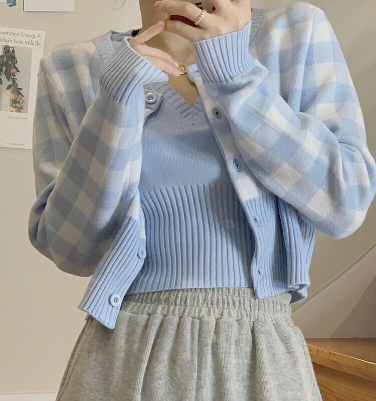 ニット カーディガン ショート丈 長袖 無地 チェック 春 秋 冬 細身 前開き かわいい 大人可愛い きれいめ シンプル カジュアル 大人 おしゃれ お洒落 大人可愛い 大人女子 こなれ感 ラフ ラウンドネック ショート 袖あり ニット 2点セット S M L 10代 20代 30代 ペア ママ 通勤 学生 通学 デート お出かけ 公園デビュー 女子会 休日 イベント 旅行 着回し 普段使い 重ね着 韓国 オルチャン ファッション コーデ 楽ちん モテ 脚長 インスタ映え ゆったり | Rena 韓国ファッション レディースアパレル