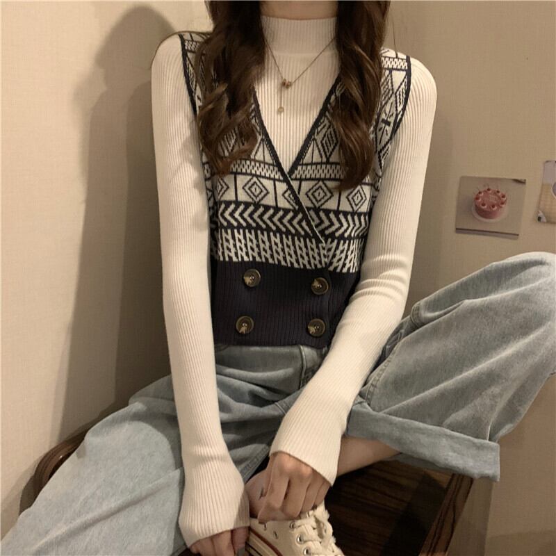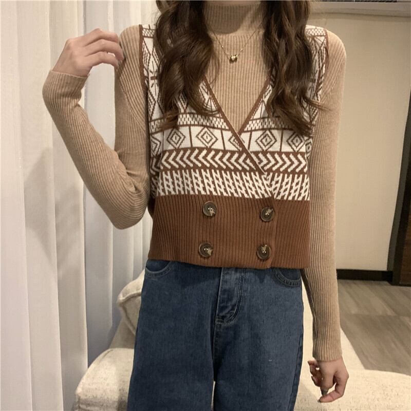 レトロなデザインがおしゃれなベストとニットのセットです。