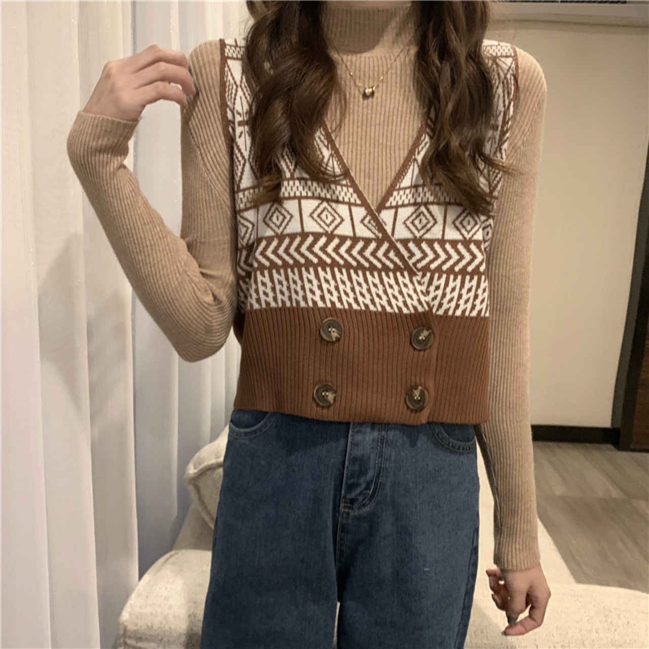 ニット ベスト ショート丈 長袖 無地 柄 春 秋 冬 スリム タイト 細身 かわいい 大人可愛い 大人 おしゃれ お洒落 レトロ エスニック 大人女子 こなれ感 キュート ガーリー 個性的 クール 存在感 ショート 袖あり ニット 2点セット お得 黒 ブラック 茶色 ブラウン 灰色 グレー S M L 10代 20代 30代 ペア ママ OL 学生 通学 デート お出かけ 公園デビュー 女子会 お泊まり 休日 イベント 着回し 普段使い 重ね着 お揃い 双子 韓国 モテ インスタ映え | Rena 韓国ファッション レディースアパレル