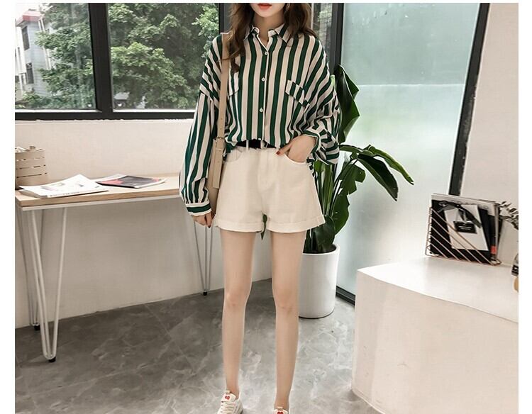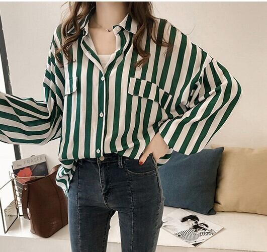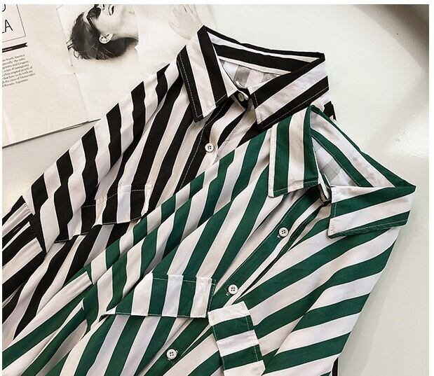 シャツ ブラウス 長袖 ストライプ 春 秋 冬 前開き 大人可愛い きれいめ シンプル カジュアル 大人 上品 おしゃれ お洒落 かっこいい 大人女子 こなれ感 ラフ 抜け感 袖あり 黒 ブラック 緑 グリーン M L XL 2XL 3XL 4XL 大きいサイズ ゆったり 10代 20代 30代 40代 50代 女性用 学生 通学 デート お出かけ 公園デビュー 休日 アウトドア 旅行 着回し 普段使い 楽ちん 体系カバー プチプラ | Rena 韓国ファッション レディースアパレル