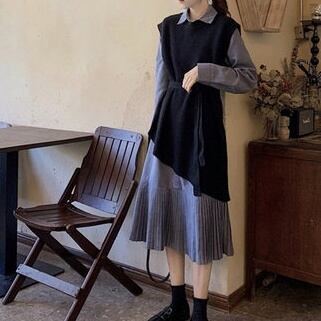 ワンピース シャツ ニット シャツワンピース ロング丈 長袖 無地 花柄 春 秋 冬 Iライン 裾フレア プリーツ ウエストリボン 切り替えデザイン 大人可愛い カジュアル 大人 お洒落 大人可愛い 大人女子 襟付き ロング 袖あり ニット 2点セット ブラック ブラウン S M L XL 10代 20代 30代 40代 通勤 学生 通学 デート お出かけ 休日 着回し 普段使い | Rena 韓国ファッション レディースアパレル