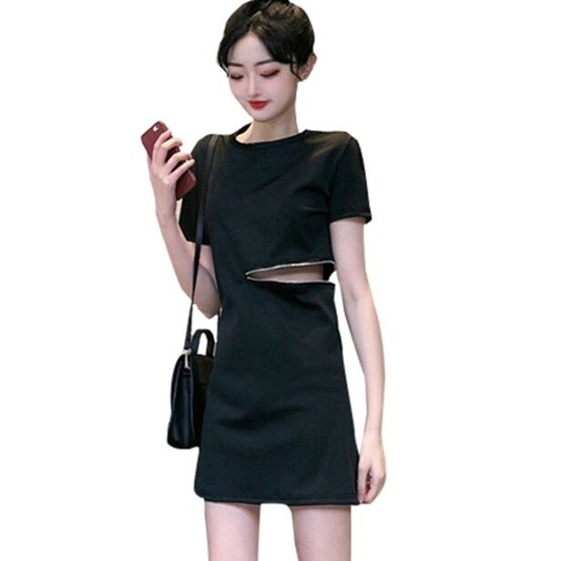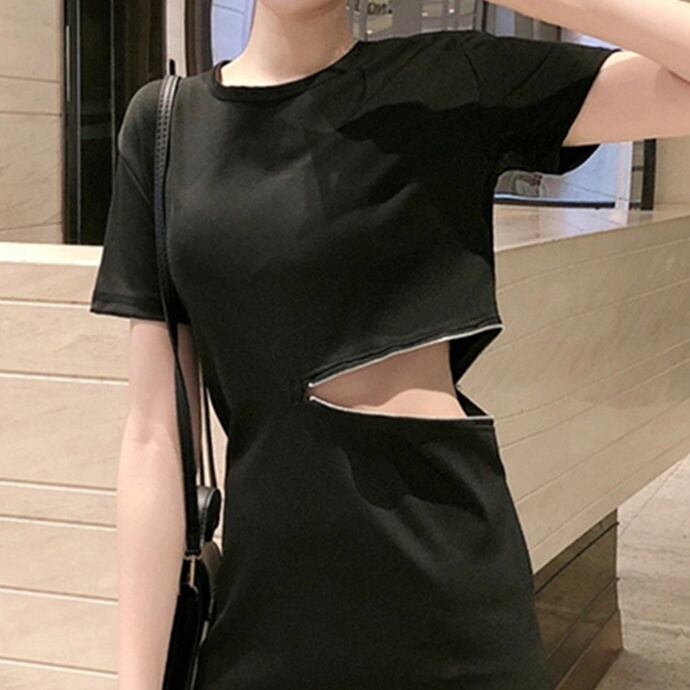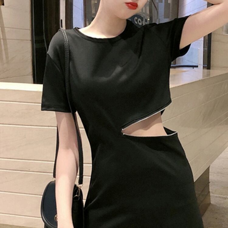 ワンピース タイトワンピース ミニ丈 半袖 無地 春 夏 秋 タイト 細身 ファスナー カジュアル かっこいい こなれ感 ラフ ボーイッシュ スポーティー 主役級 Uネック ミニ 袖あり 黒 ブラック S M L XL 10代 20代 30代 学生 通学 デート お出かけ 休日 パーティー イベント 旅行 海 スタイル 楽ちん | Rena 韓国ファッション レディースアパレル