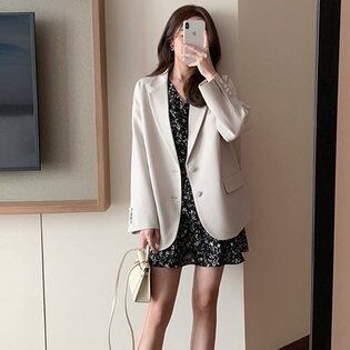 ジャケットはお尻が隠れる丈感で少し大きめのシルエットなので体型カバーができ、ワンピースは落ち着いた色合いで一枚でもアウターをオンしてもOK!