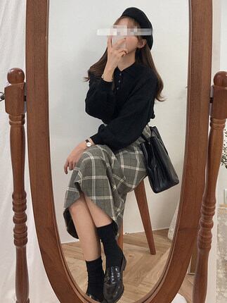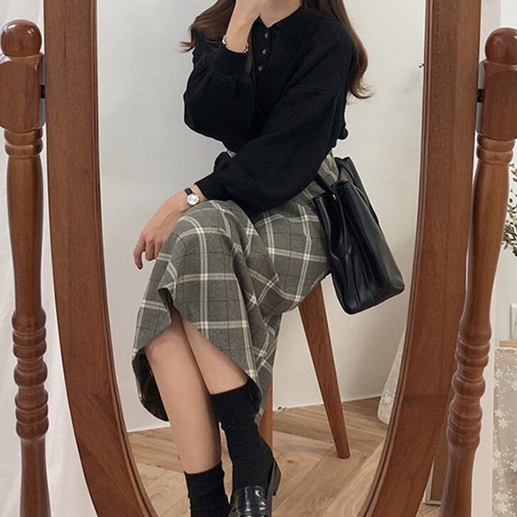 ニットは他にはないデザインのポロカラーが可愛く、スカートは秋の定番チェック柄・Aラインのミドル丈で上品さがあります。