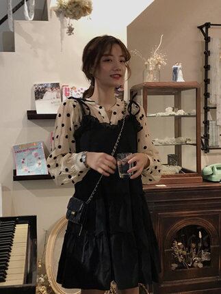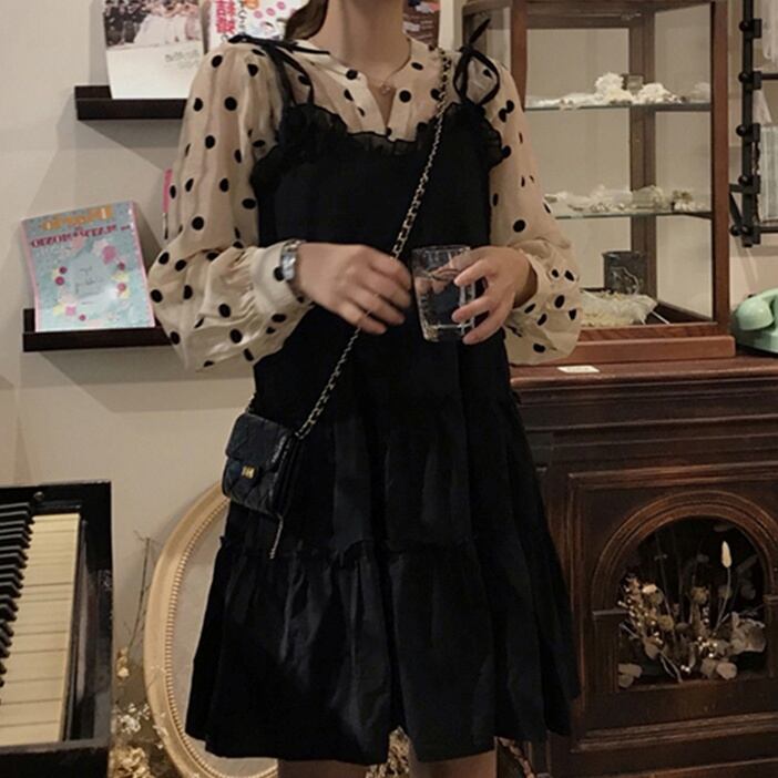 ワンピース ブラウス キャミソールワンピース ミニ丈 長袖 無地 春 夏 秋 ティアード フリル 透け感 シースルー かわいい おしゃれ ラブリー キュート ガーリー 存在感 抜け感 Vネック ミニ パフスリーブ 2点セット 黒 秋カラー S M L XL 10代 20代 30代 学生 通学 デート お出かけ 女子会 パーティー イベント ファッション | Rena 韓国ファッション レディースアパレル