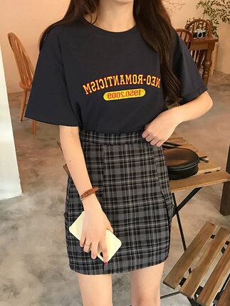 カジュアルコーデの定番のTシャツと秋にぴったりのチェック柄のタイトスカートのセット商品です。