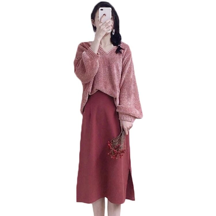 セットアップ セーター フレアスカート ミモレ丈 長袖 無地 秋 冬 フレア ふわふわ かわいい 大人可愛い きれいめ シンプル 大人 上品 おしゃれ 大人可愛い 大人女子 エレガント Vネック ミモレ ボリューム袖 プルオーバー ニット 上下セット 赤 レッド S M L XL ゆったり 10代 20代 30代 40代 50代 60代 オフィス ビジネス OL 通勤 通学 デート お出かけ 女子会 休日 楽ちん あったか | Rena 韓国ファッション レディースアパレル