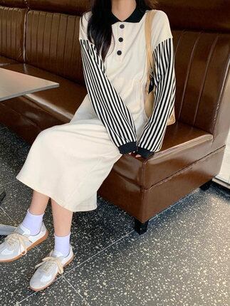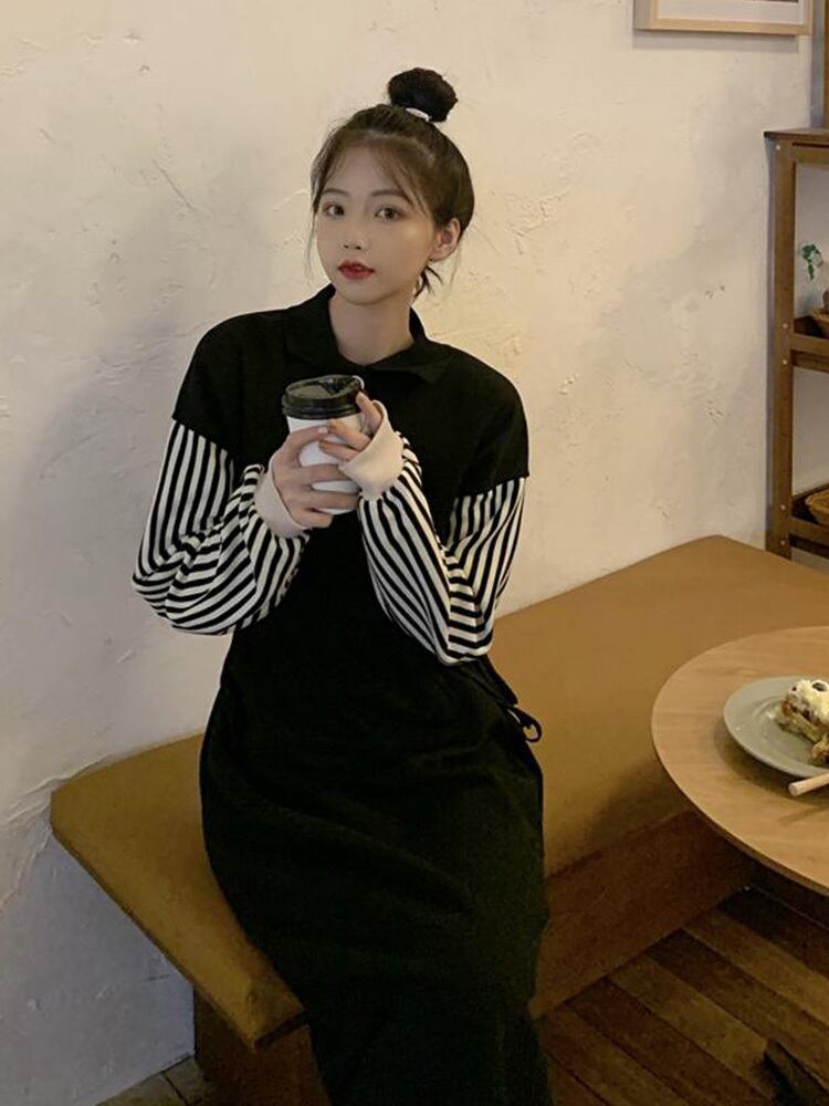ワンピース ロング丈 長袖 ストライプ 春 秋 冬 ストレート かわいい 大人可愛い シンプル カジュアル 大人 おしゃれ 大人可愛い 大人女子 キュート ヘンリーネック ロング ワンピドレス 白 黒 S M L XL 10代 20代 30代 40代 オフィス OL 通勤 学生 通学 デート お出かけ 公園デビュー 女子会 休日 スタイル 楽ちん 体系カバー | Rena 韓国ファッション レディースアパレル