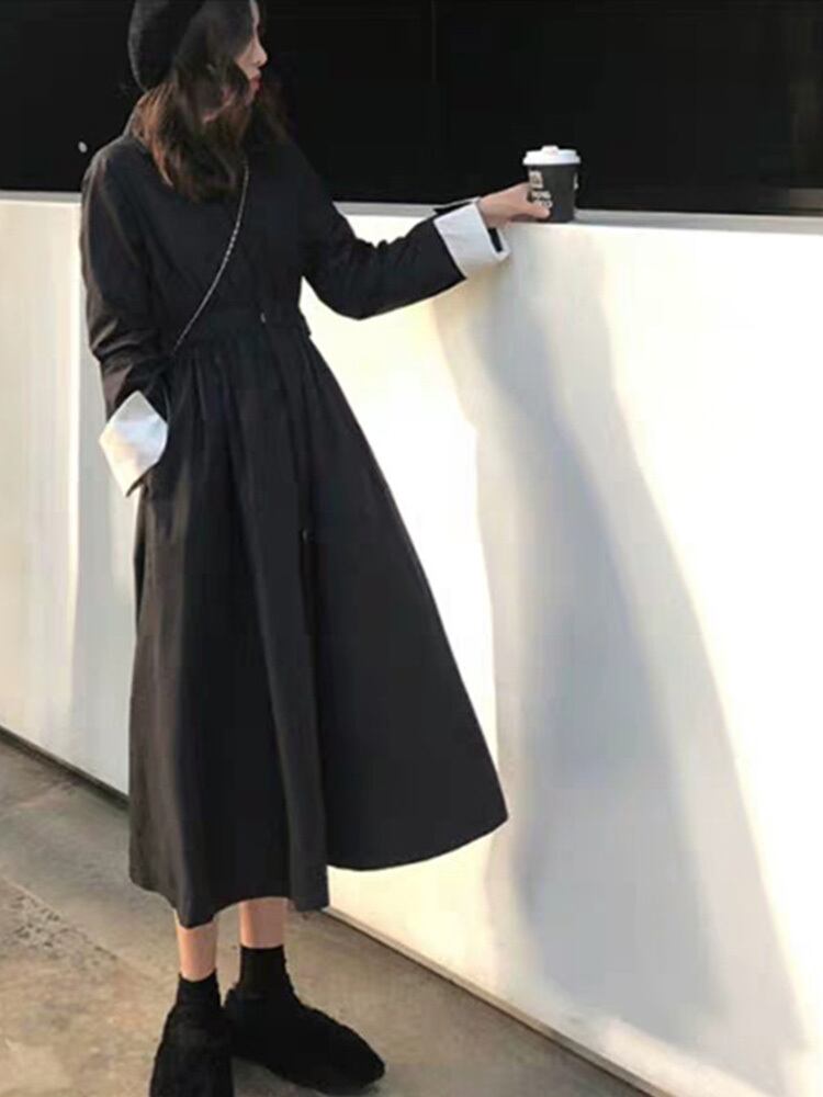ワンピース ロングスカート シャツワンピース ロング丈 長袖 無地 春 秋 フレア きれいめ 大人 上品 おしゃれ お洒落 かっこいい 大人女子 こなれ感 ロング 黒 ブラック ベージュ S M L XL 学生 通学 デート お出かけ イベント 旅行 脚長 | Rena 韓国ファッション レディースアパレル
