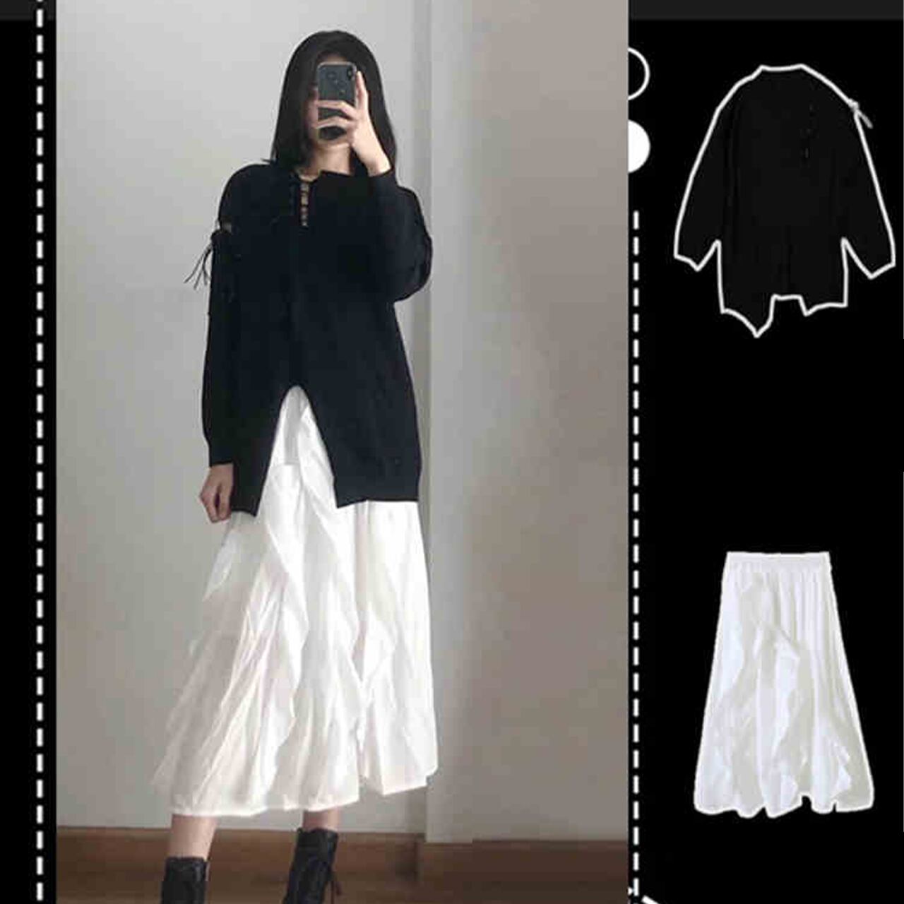 カジュアルな雰囲気のブラックのセーターと、ホワイトのスカートのツーピースセットです。